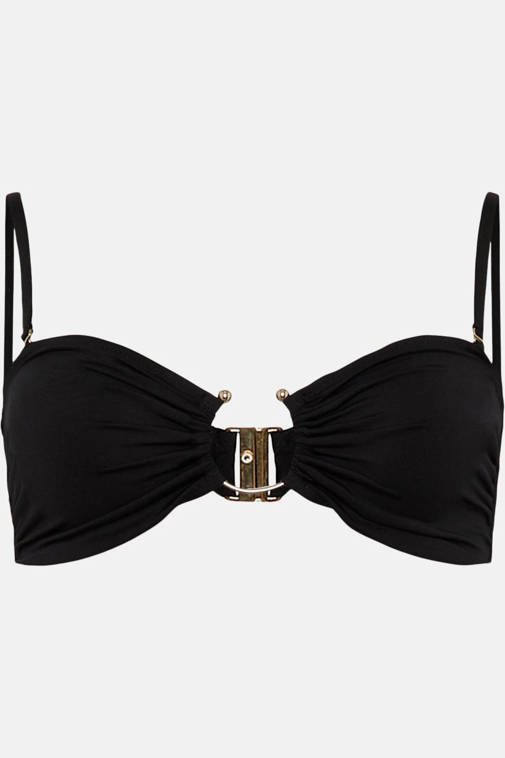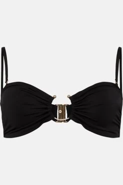 A gleaming semi-circular gold clasp lends this sleek bandeau bikini top a glamorous finish. It comes expertly crafted from partially recycled fabric with the perfect hint of stretch and features removable shoulder straps so you can forget about tan lines. Fastening at the back with a bar-style clasp, this Bond Girl-worthy top ensures youre ready for your moment in the sun (and the spotlight).