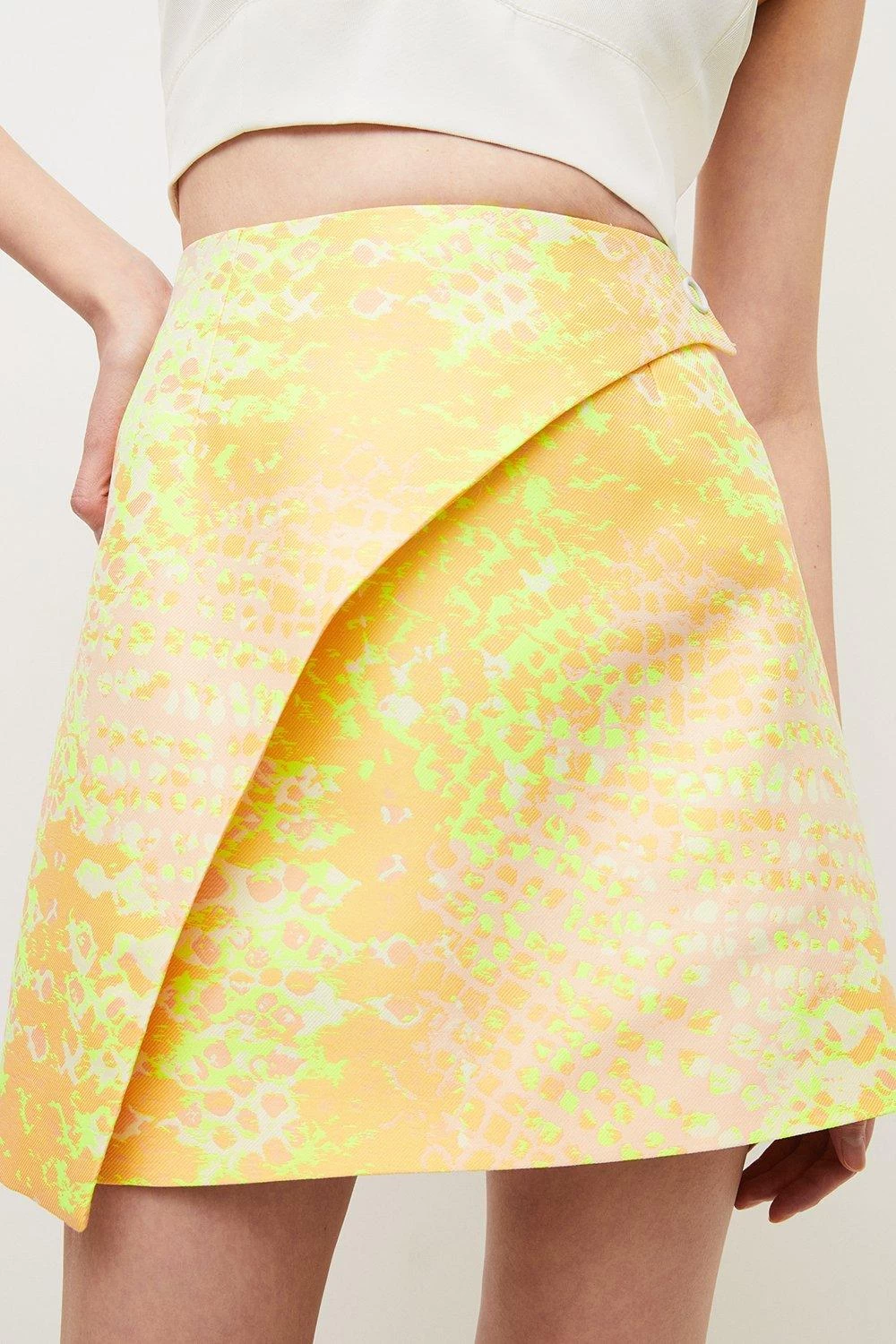 Nothing lengthens legs quite like this modish animal jacquard mini skirt. Detailed with a wrap-over front and simple press buckle closure, it breathes new life into your skirt collection and has a retro, 1960s-inspired vibe. Trimmed with a concealed zip at the back, it looks effortless styled with a form-fitting vest top and chunky platform heels.