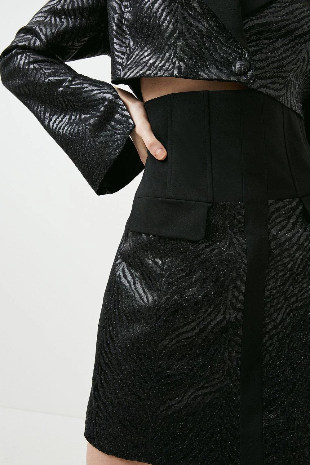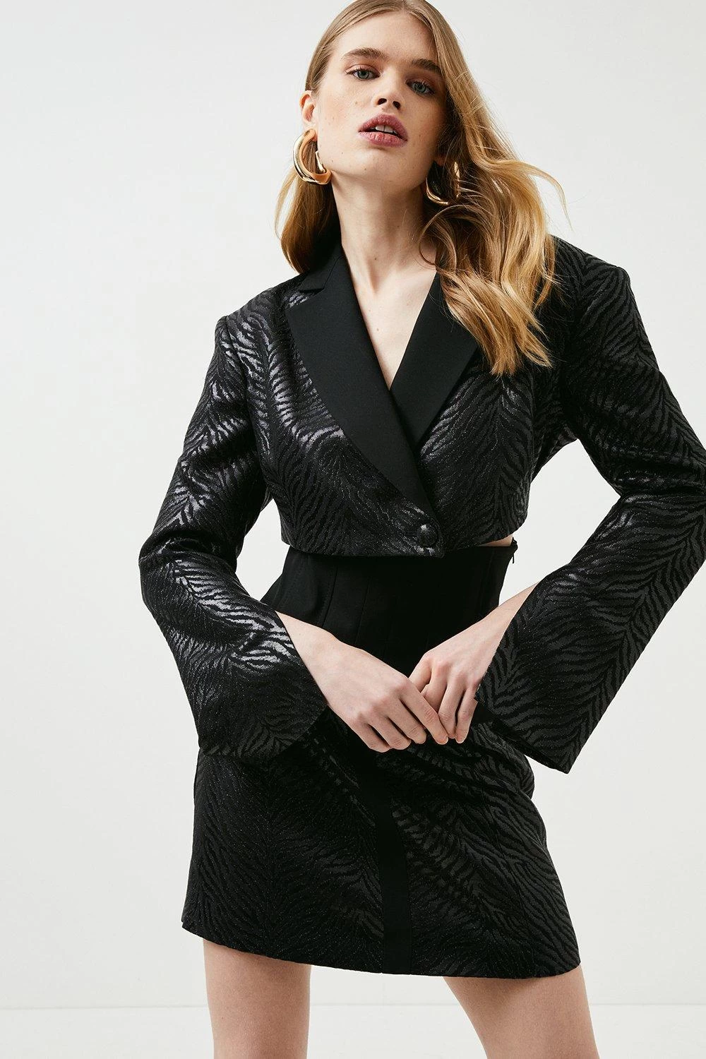 Made for modern dressers, this statement blazer dress shows off a cropped, boxy top half complete with contemporary split cuffs. Contrasting with the voluminous sleeves, our designers have created a corset-style skirt that gently sculpts curves. A truly directional design, offset the tonal animal-print jacquard motif with chunky black heels and gleaming gold jewellery.