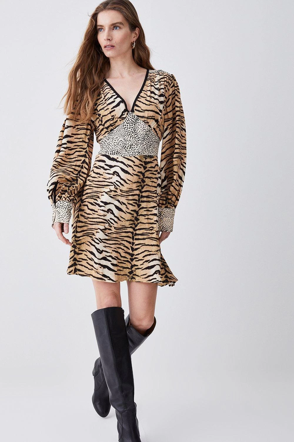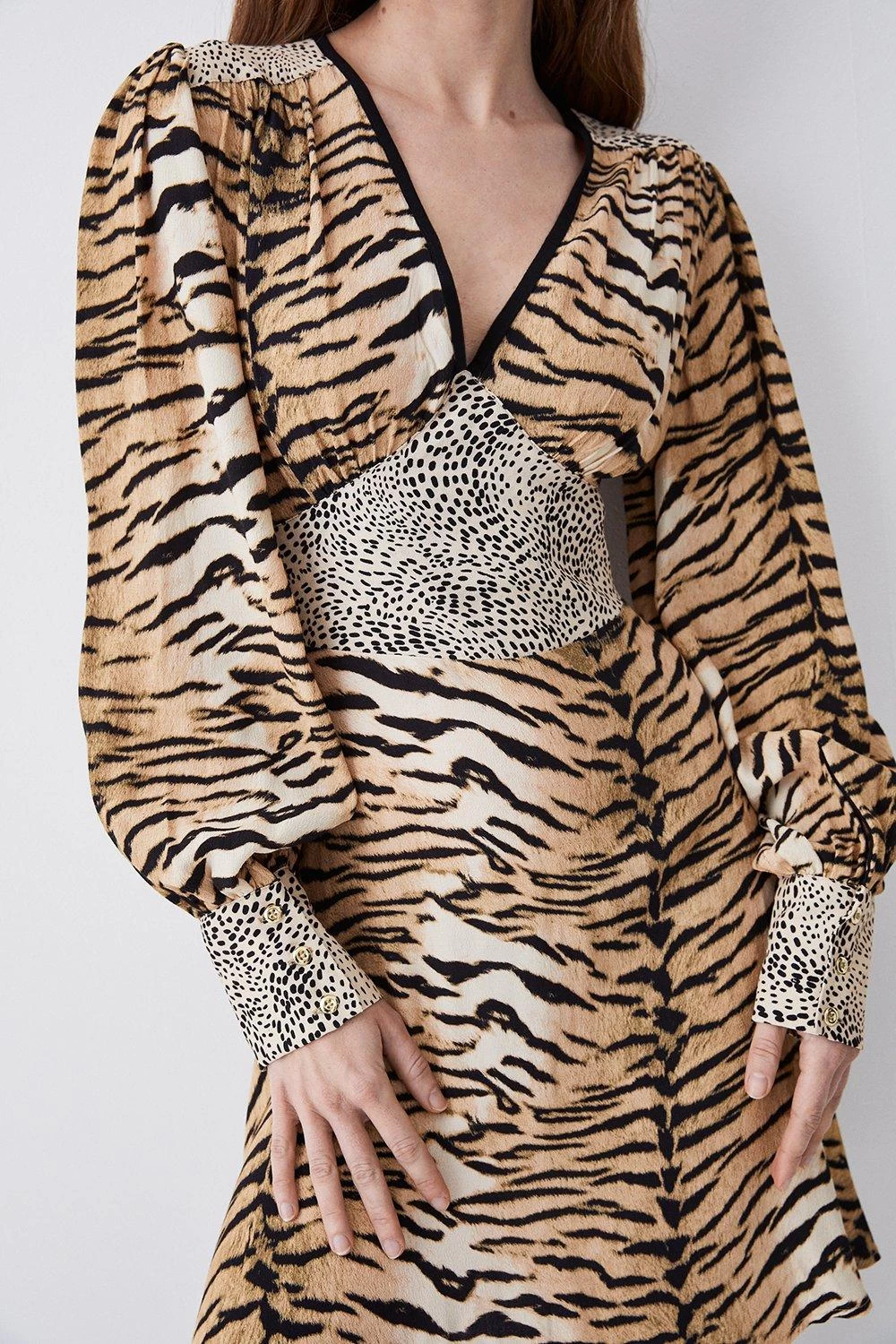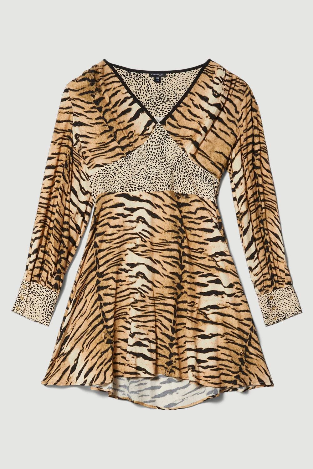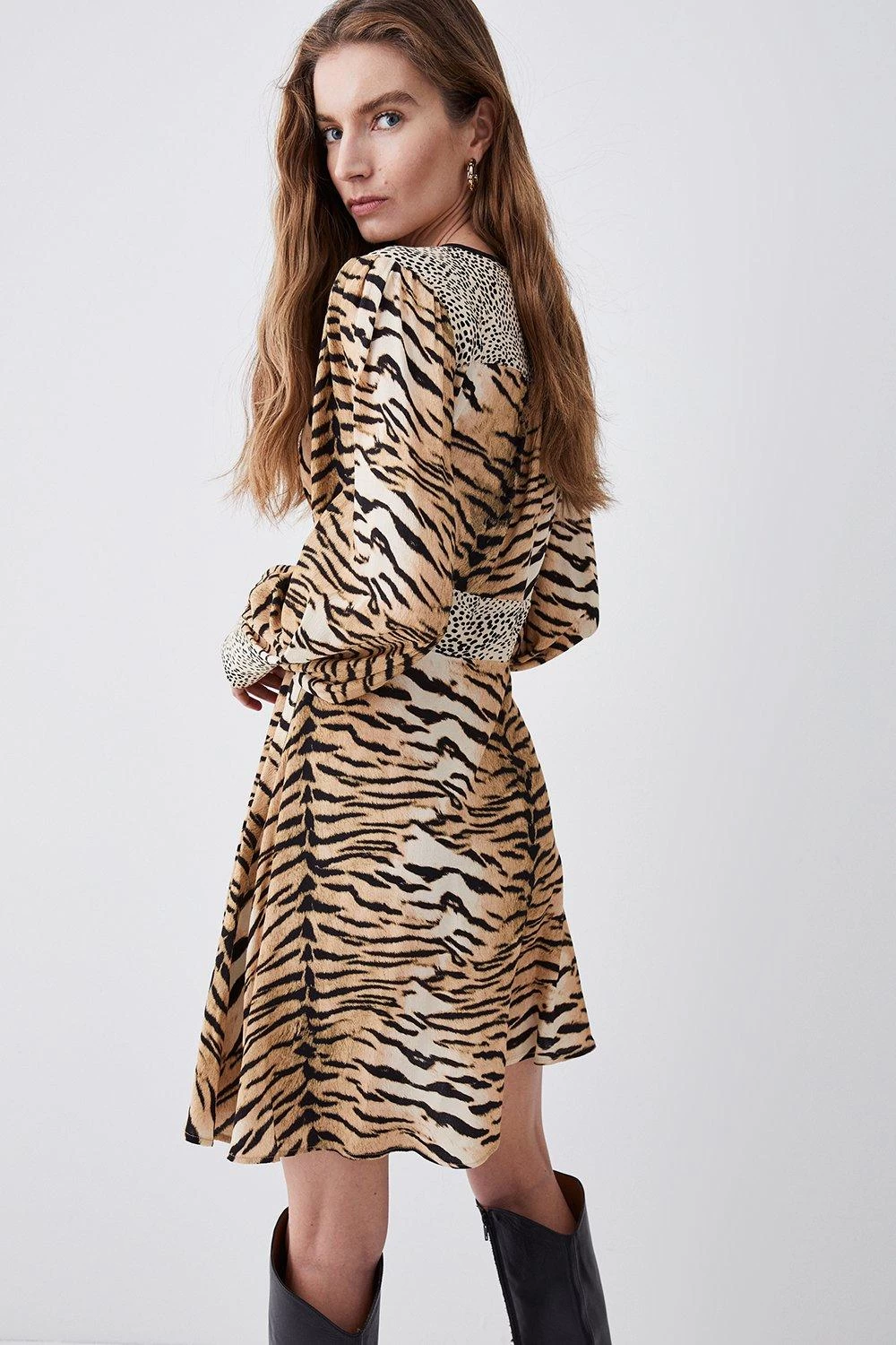 Showcasing an intricate mixture of animal prints, this mini dress makes an instant statement. The classic wrap silhouette is cinched at the waist to accentuate the form. The A-line skirt lands on a thigh-grazing mini hemline, making this the perfect warm-weather piece.