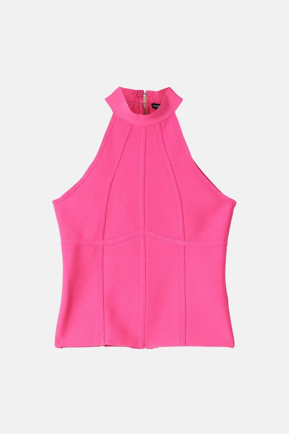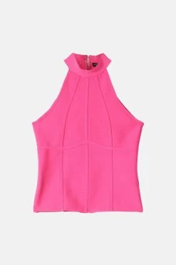 Crafted in bandage knit fabric that seamlessly sculpts the form, this halter-neck top accompanies jeans, tailored trousers and leather leggings in premium style. Contrast contours add easy structure to this streamlined design, whilst the zipped back detail lends endless sporty appeal to any new-season outfit.