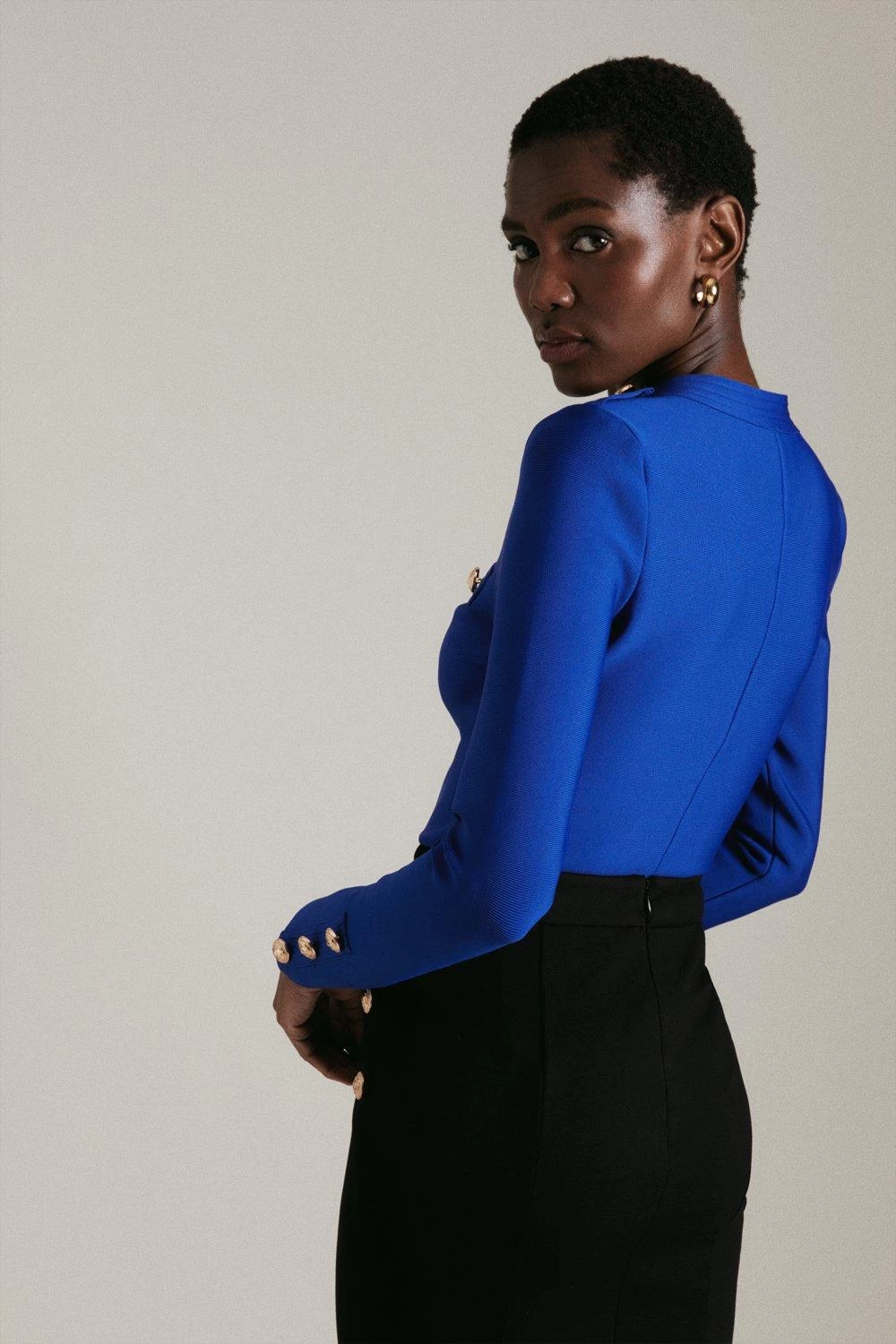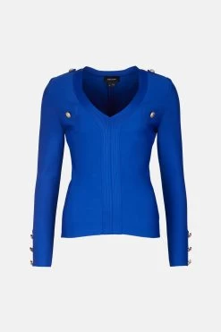 Stock your wardrobe with well-cut staples and youll never face a dressing dilemma again. Our bandage knit top is a stylish example ? cut to a figure-hugging silhouette and punctuated with glossy military-inspired buttons, it makes a polished partner for your favourite skirts or coated trousers..