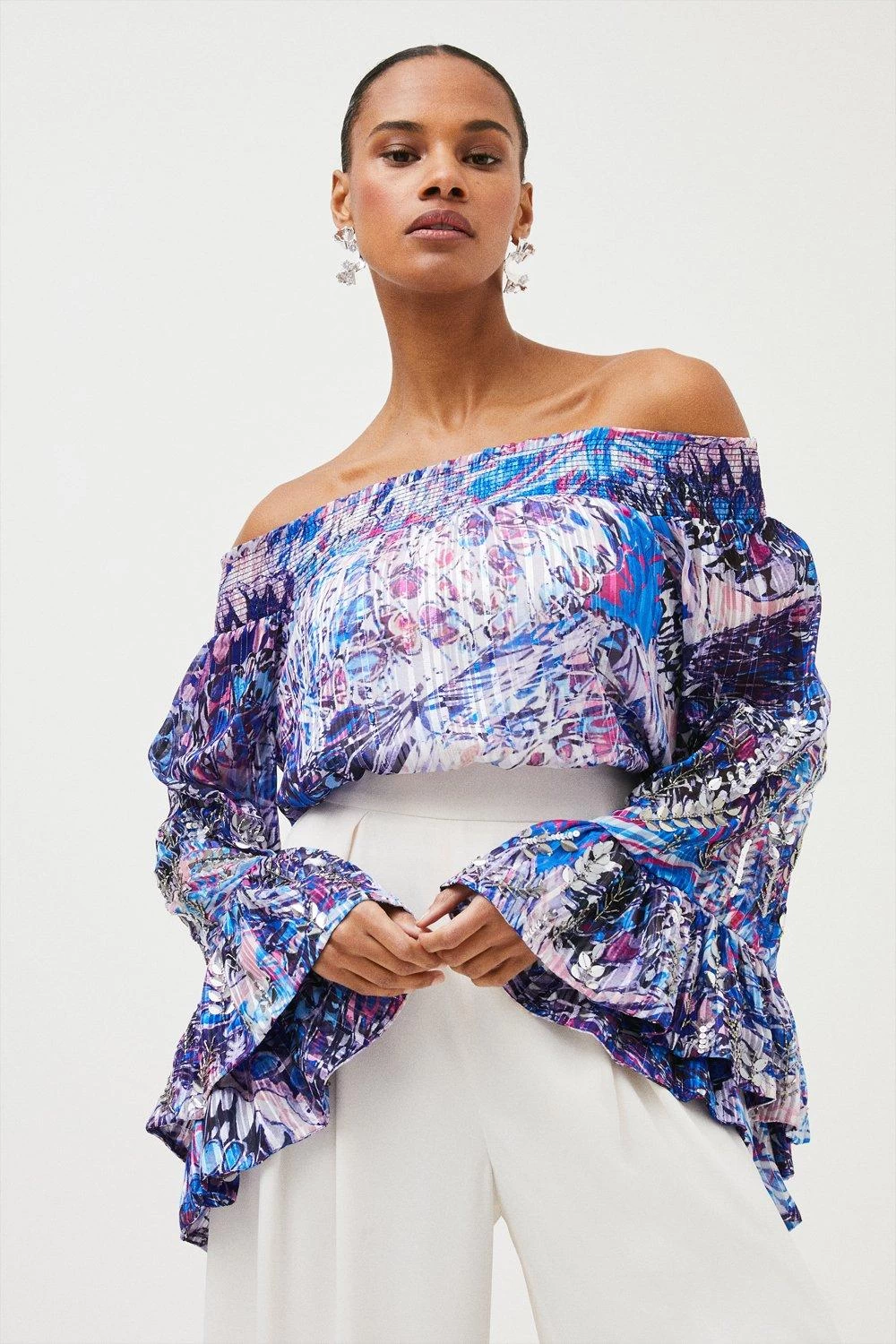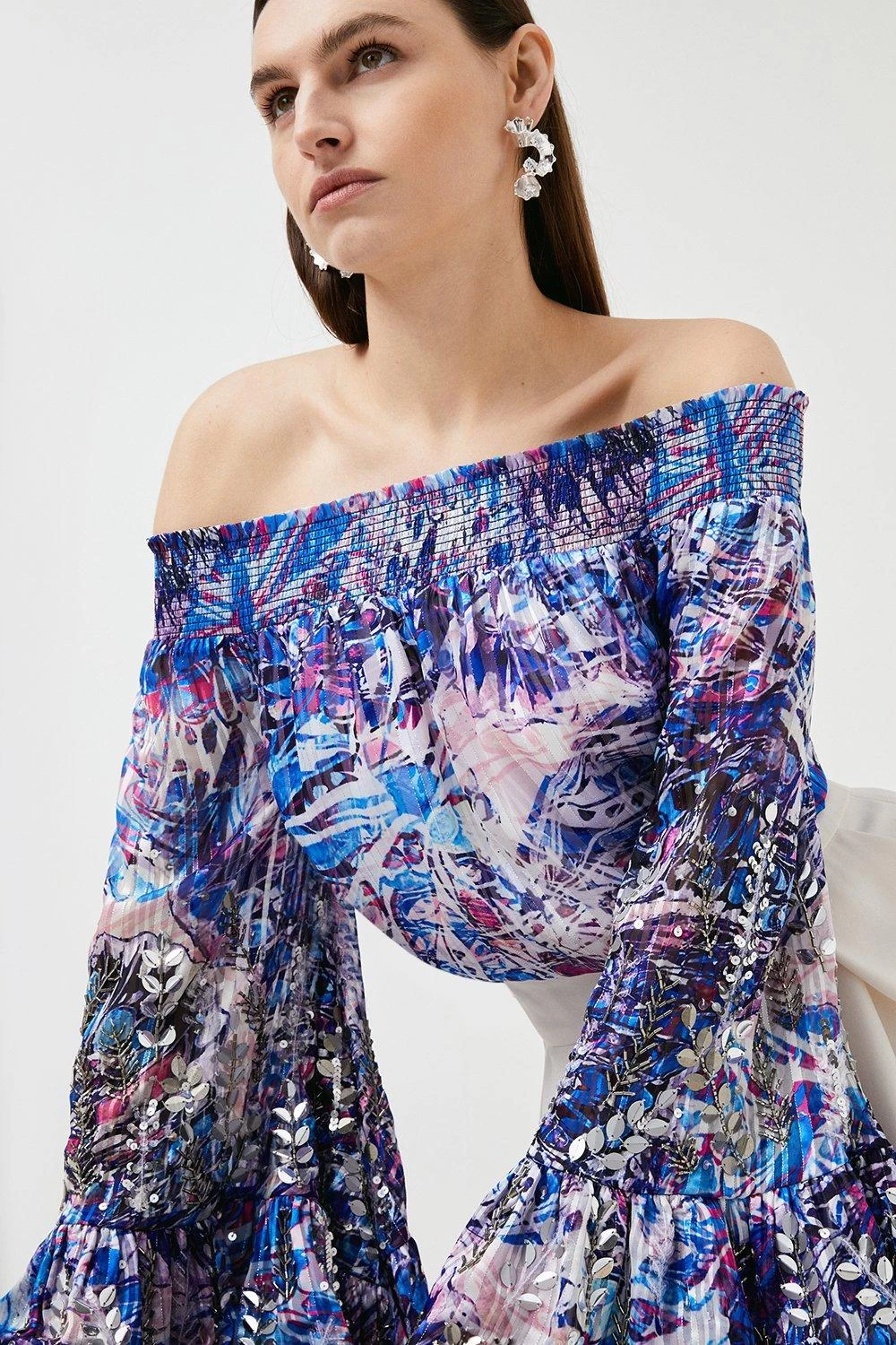 Dramatic flared sleeves and a sultry off-shoulder fit lend this printed top endless after-dark allure. Detailed with intricately sewn beads, it instantly dresses up wide-leg trousers or your favourite A-line skirt.