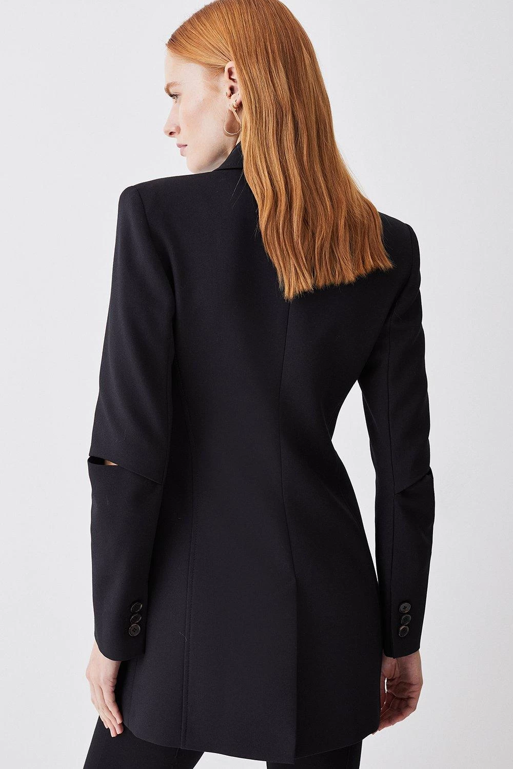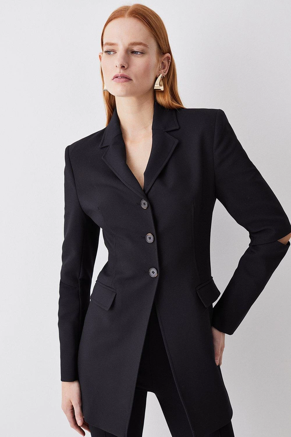 Take a contemporary approach to formal dressing with this clean tailored blazer. This piece features cutout details at the elbow, offering a fashion-forward aesthetic. Single-breasted buttons, flap pockets and notched lapels offer a polished finish. Style this piece with slim-leg trousers for a sleek ensemble.