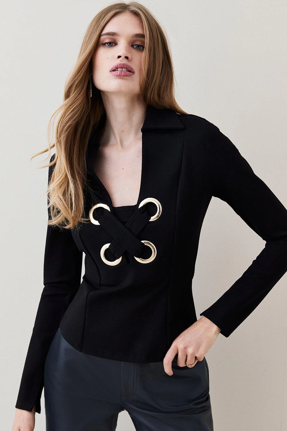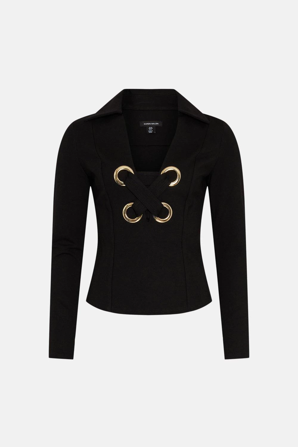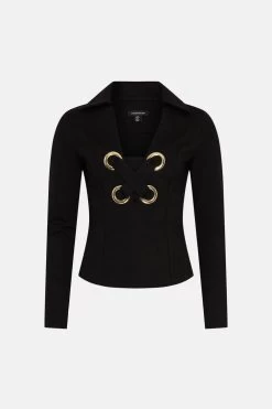 Big impact, minimal effort. This show-stopping jersey top features oversized eyelets and lace-up detailing framing the front, offsetting a pointed collar for that inimitable 1970s feel. Highlight the plunging neckline with a gleaming silver necklace to match the elegant eyelets.