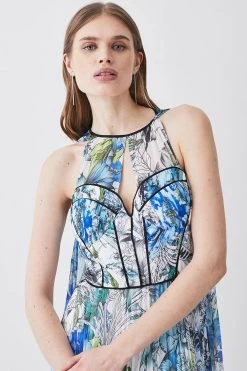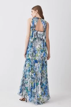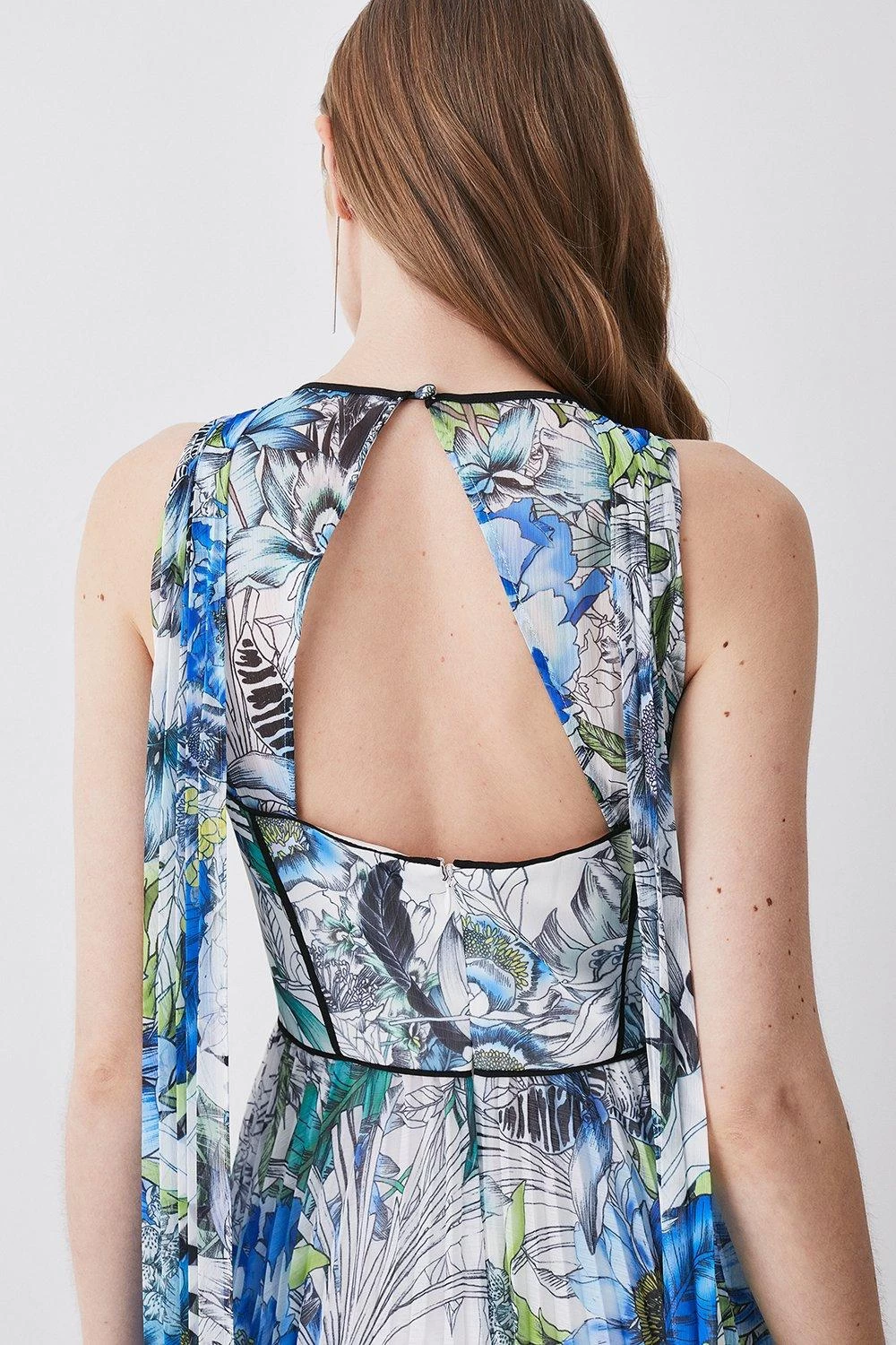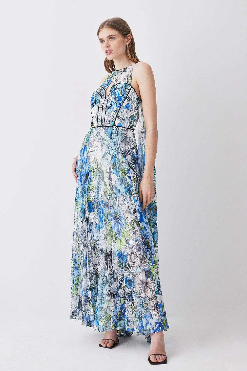 Enhanced with a rich floral print, this dress exudes undeniable elegance. Soft pleats cascade down to a maxi hemline, while a Watteau-style train adds an ethereal element. A corset bodice helps to cinch the waist, creating a flattering silhouette.