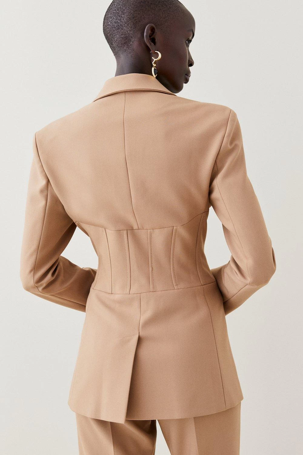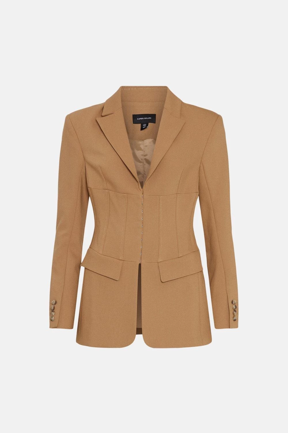 A fresh take on tailoring, this corset-waist blazer translates effortlessly from work to the weekend. Framed with a delicate row of hook-and-eye closures, raised seams and faux flap pockets, it adds directional allure to any occasion. Contrast the sharp details – think notched lapels and buttoned cuffs – with chunky gold jewellery.