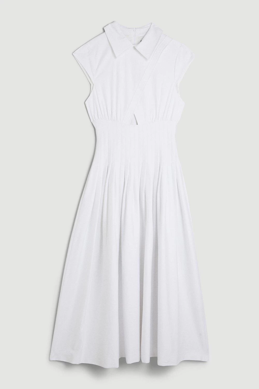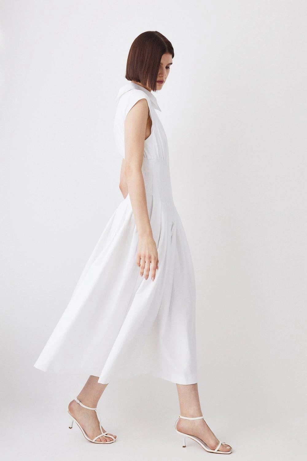 This classic summer dress has been reimagined with a contemporary vision, showcased through a flattering pressed crease waistband, layered bodice and collared neckline. A cotton composition creates a naturally lightweight feel.