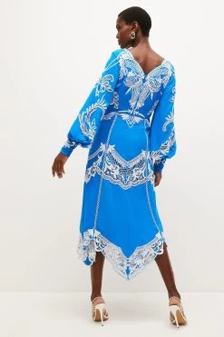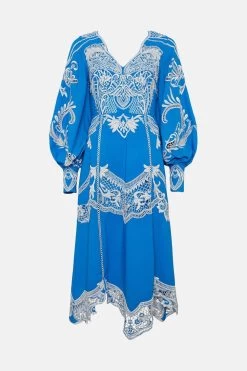 Defined by its intricate lace panels and opulent cutwork, this artisanal midi dress feels perfect for long, languid summer get-togethers. It boasts a romantic scalloped V-neckline, puffed sleeves and buttoned cuffs, offsetting a scalloped lace hem for a final romantic flourish.