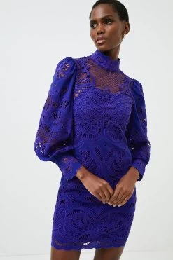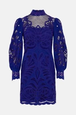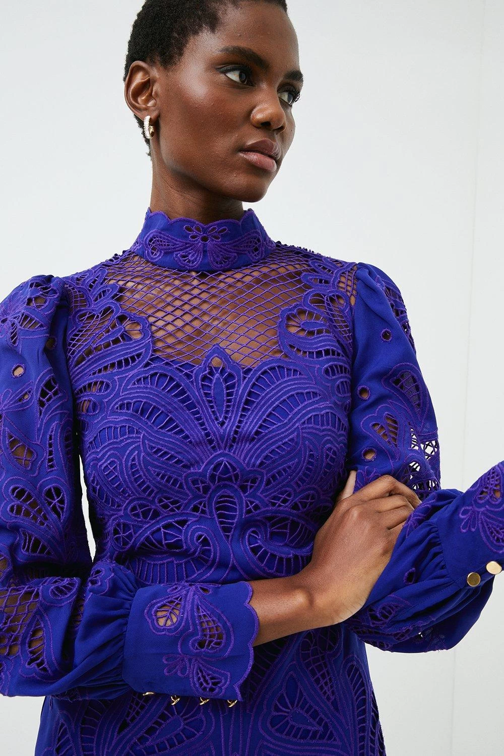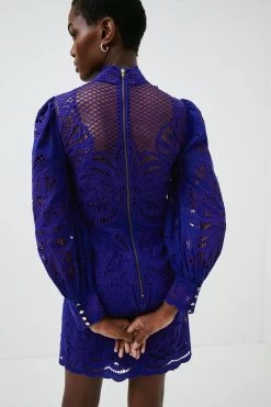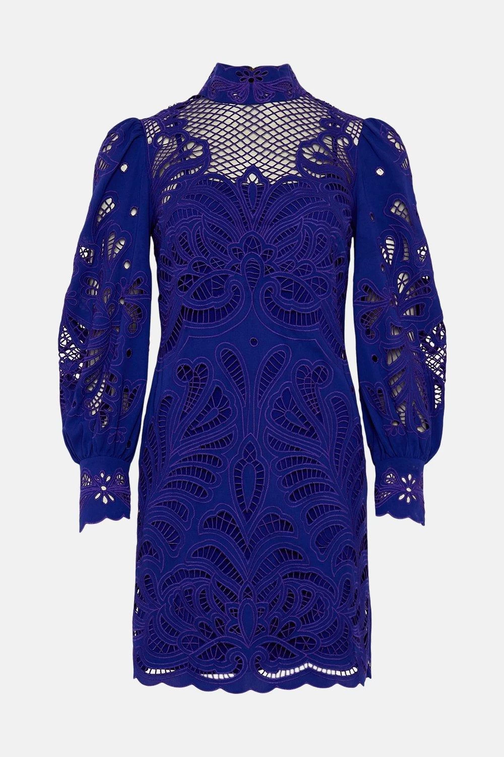 Nodding to the opulence of another era, this sumptuously crafted mini dress comes detailed with fine cutwork and scalloped trims. Accentuate its softly puffed sleeves, artisanal details and delicately buttoned cuffs with strappy heels for sunset cocktails.