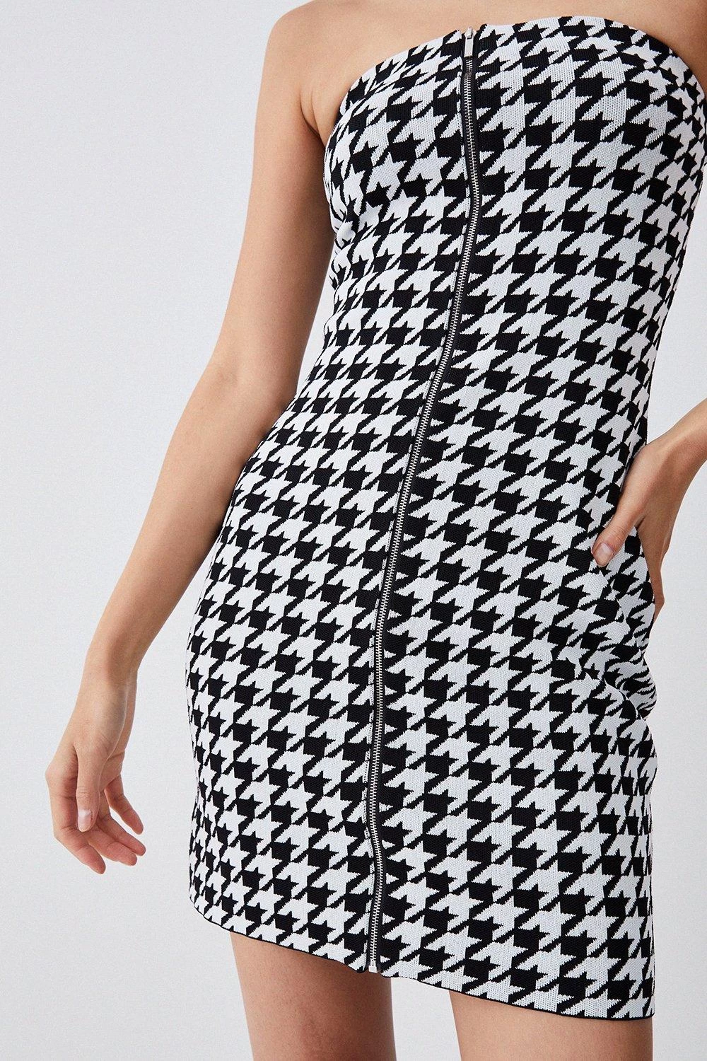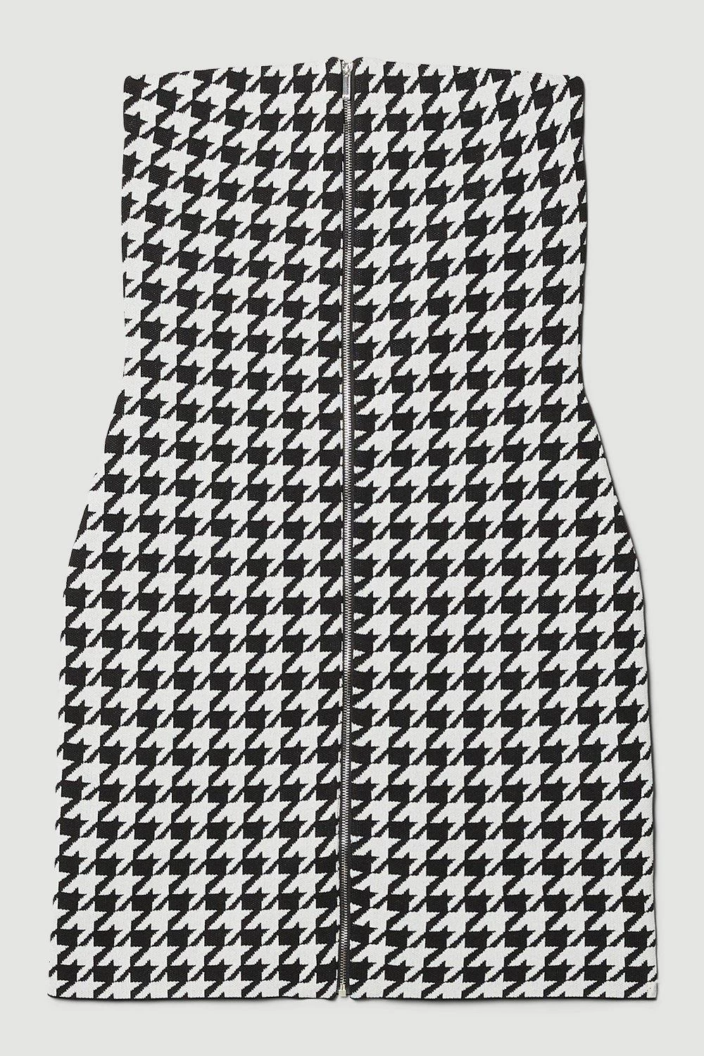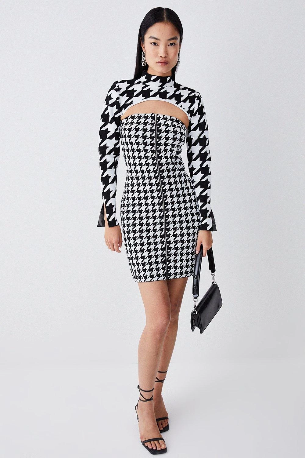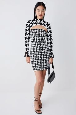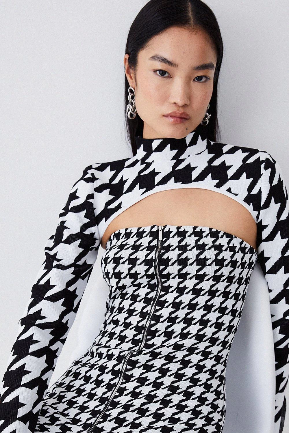 This mini dress set gives a contemporary update to the traditional Dogtooth duotone pattern. A form-fitting bandeau mini dress skims the silhouette, while a bolero-style extreme crop top adds fashion-forward dimension.