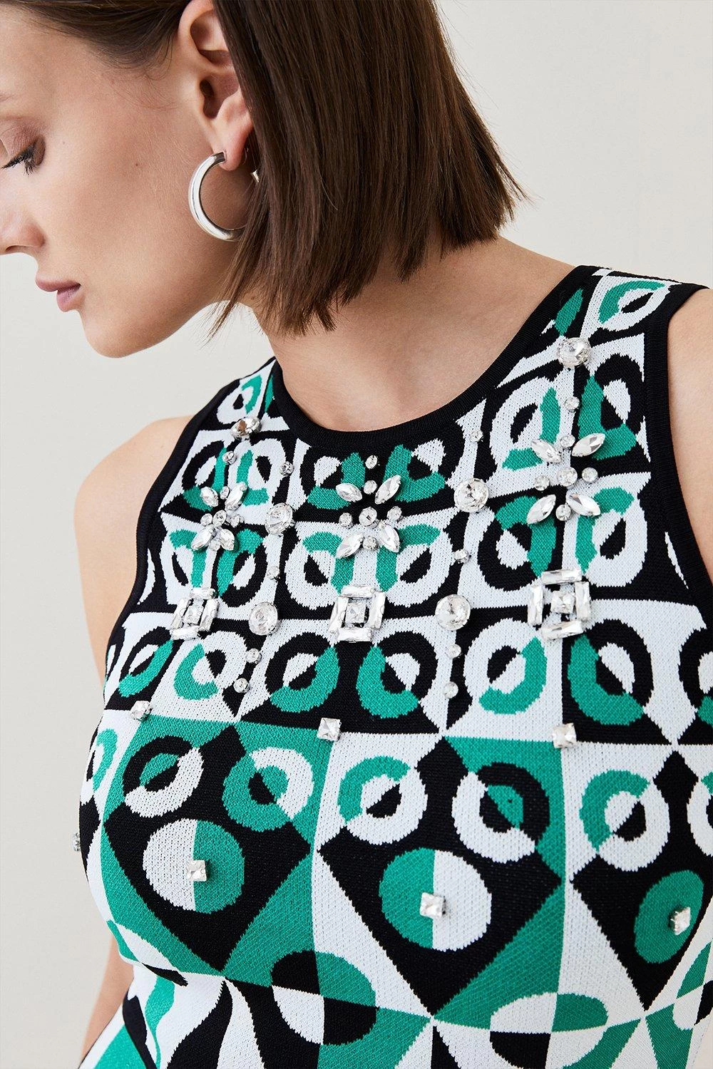 Trimmed with light-catching crystals, this sleek jacquard swing dress nods to the 1960s with its bold geometric print. Fitted to the figure at the top and flaring out at the hem, it effortlessly elongates the legs and pairs perfectly with chunky platforms.