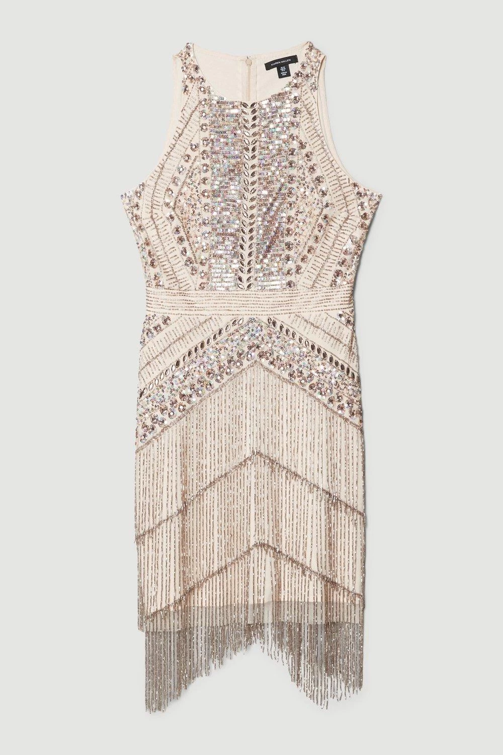 Add a touch of Old Hollywood glamour to your partywear repertoire with this dazzling fringed mini dress. Adorned with intricate sequins, claw crystals and fringe tassels that swish with every step, this dress encapsulates the ultimate party-ready mood.