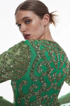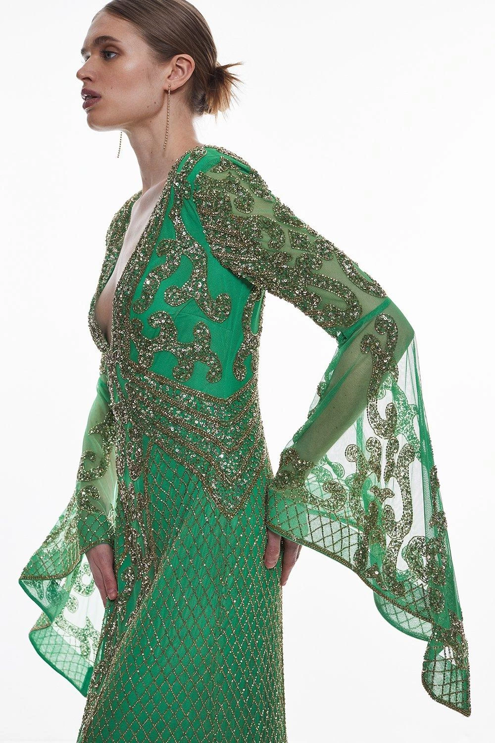 Grown-up glamour, guaranteed. Combining statement kimono sleeves with a feminine silhouette, this beaded maxi dress makes a glamorous mark at special occasions. The plunging V-neck bodice complements thousands of sparkling embellishments and a subtly flared hem.