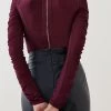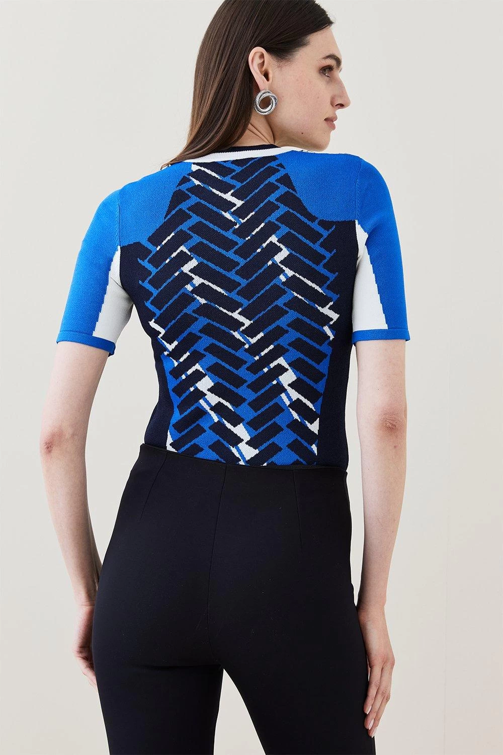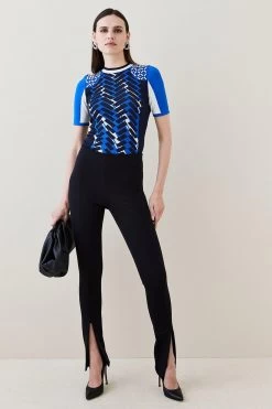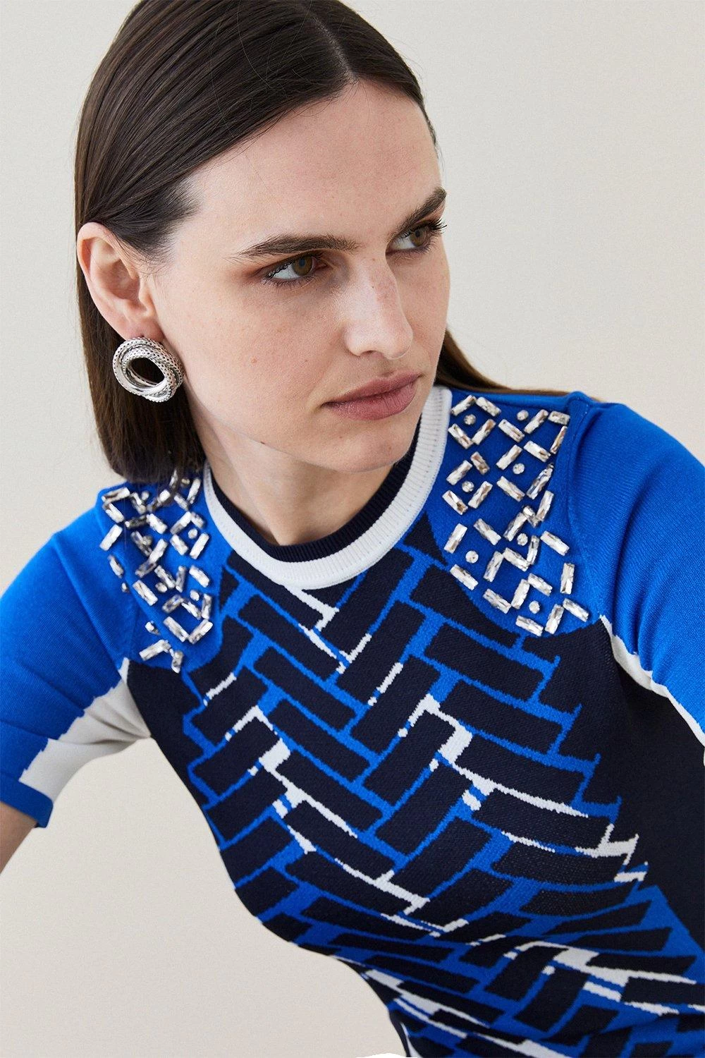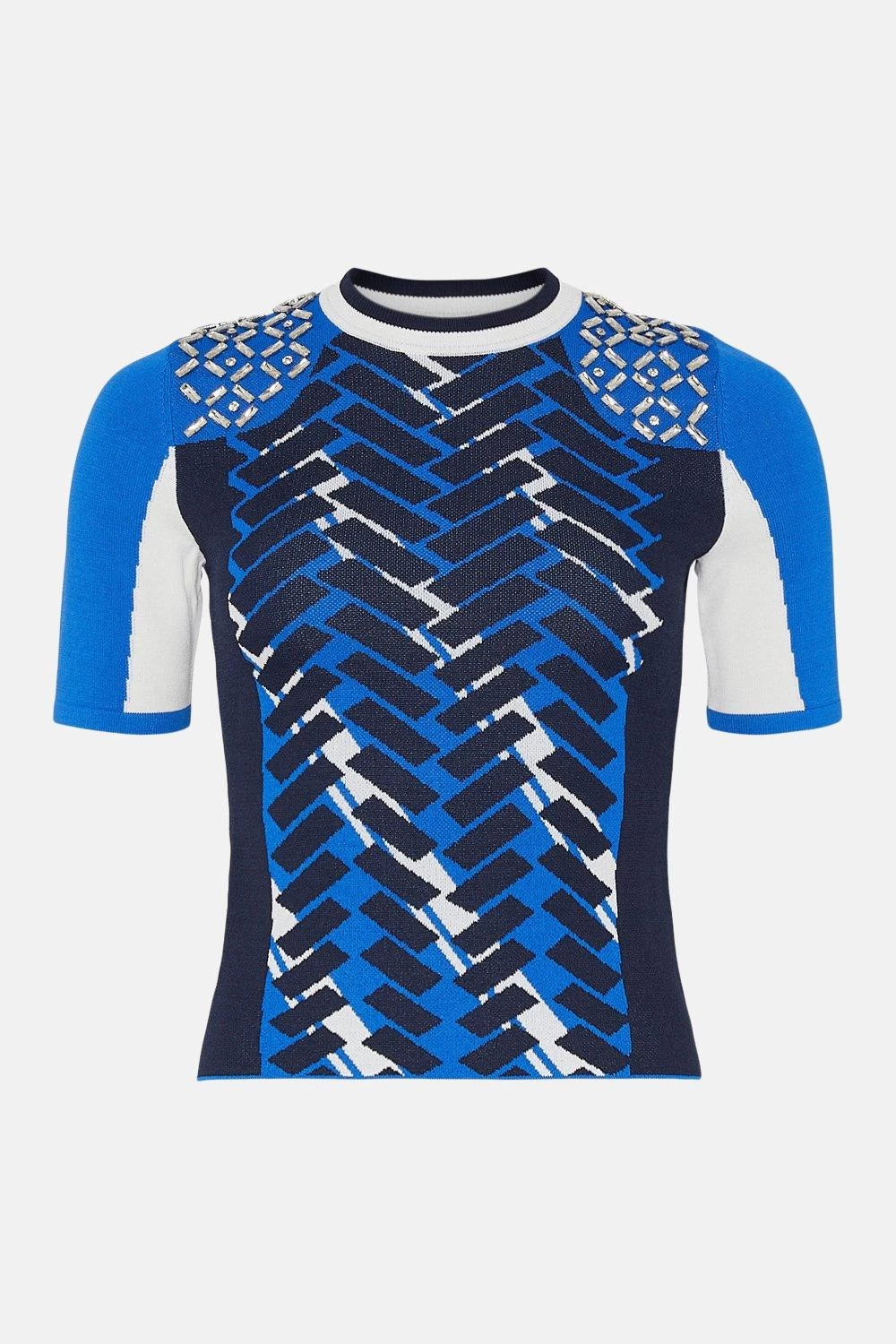Where sporty meets sleek. This fitted top blends a bold jacquard motif with light-catching crystal embellishments sprinkled at each shoulder. Tight, short sleeves complement a tipped neckline for that inimitable sports-luxe finish.