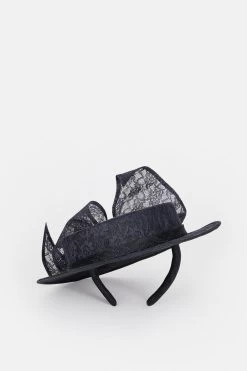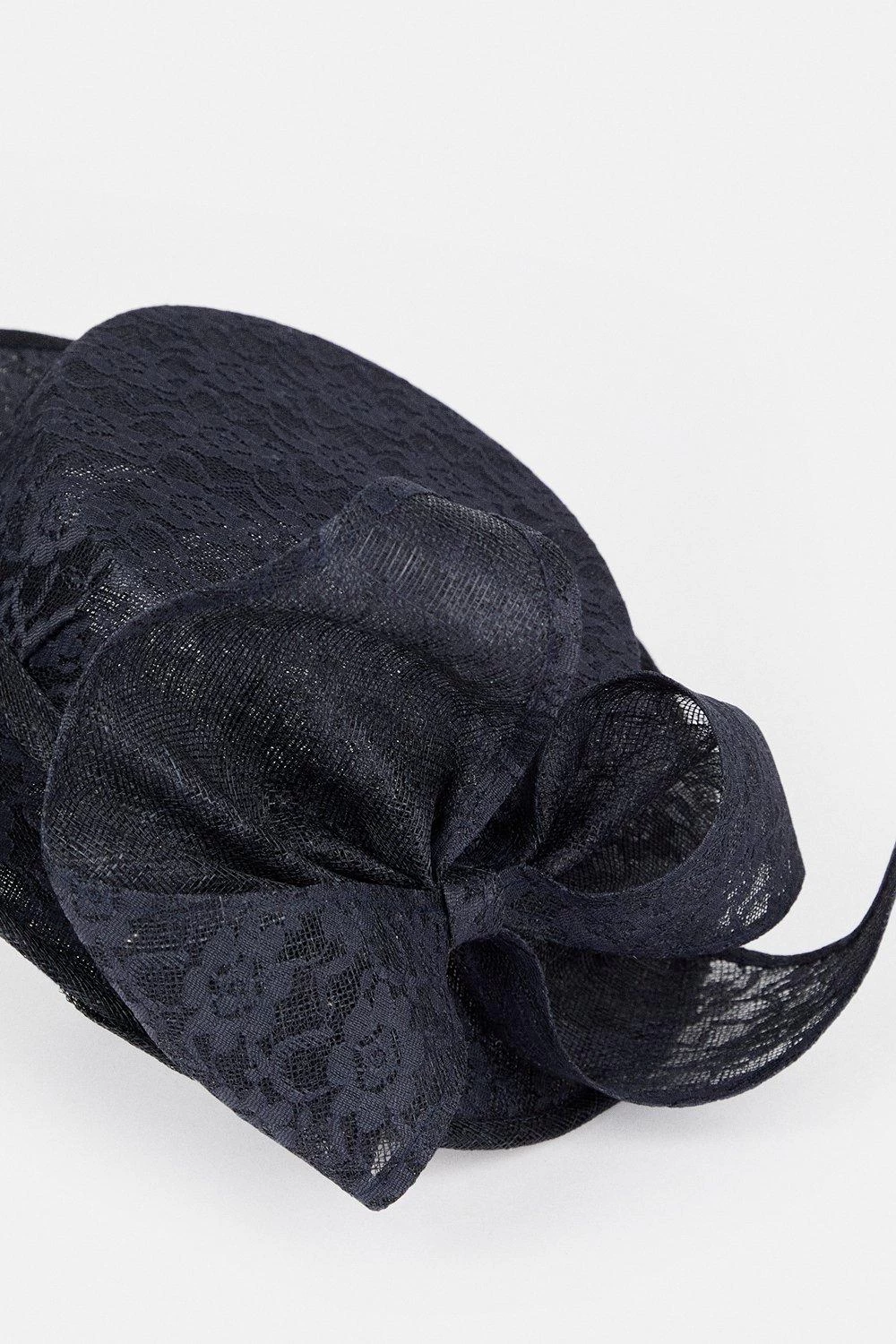 Exude confidence in this impactful boater hat. Delicate lace details infuse this piece with undeniable elegance, while a statement bow design adds a glamorous finish. Style this hat with a suit co-ord or tailored dress for a sophisticated occasion ensemble.