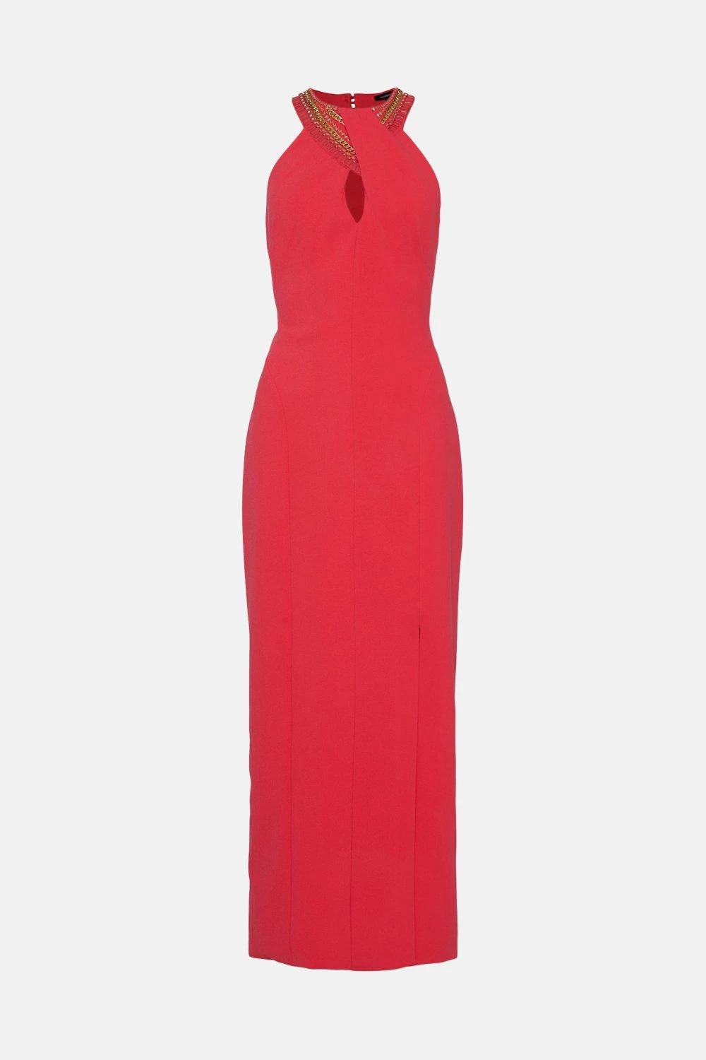 A bold take on Grecian glamour, this ankle-hitting maxi dress comes detailed with chunky chain-and-bead embellishments at the neckline. With its alluring front cut-out and classic column silhouette, it ticks all the right boxes for sultry summer soirees, draping down to a seductive split hem for a daring finishing touch.
