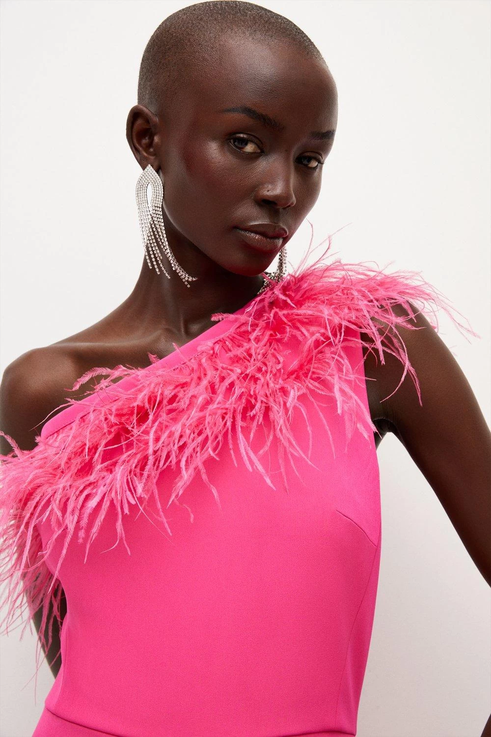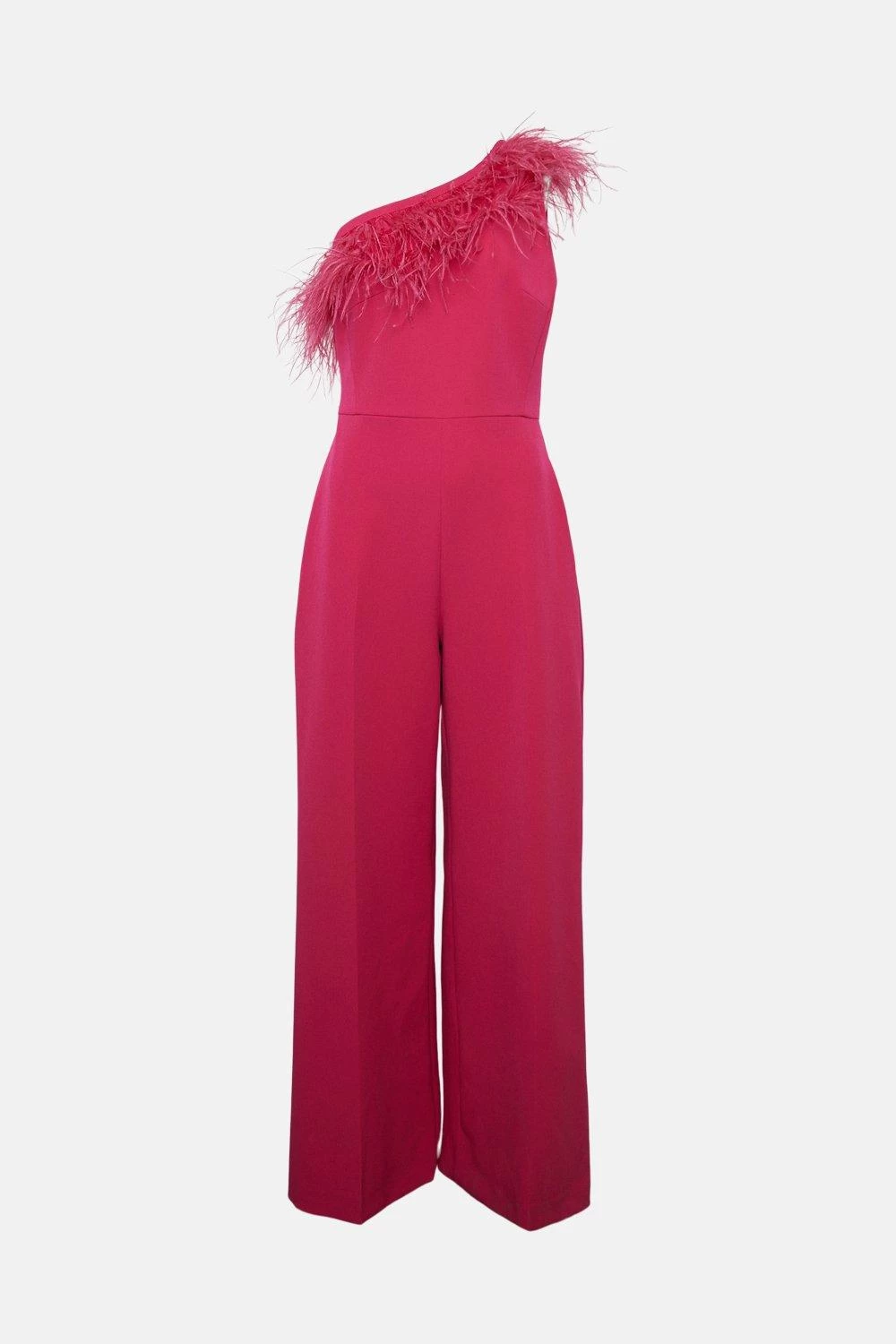Make an entrance. This show-stopping colour-pop jumpsuit comes framed with flamboyant feathers along the neckline, highlighting a unique asymmetric strap. Flowing down to a flattering wide-leg fit, this standout piece was made to show off in this summer.
