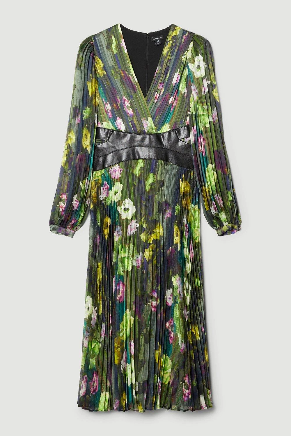 Crafted in a calming green floral print, this pleated dress exudes elegance. Balloon sleeves give a bohemian mood to the piece, while soft pleats add classic appeal. A PU leather trim across the waist adds definition to the floaty silhouette, complete the look with leather knee-high boots for a sophisticated finish.
