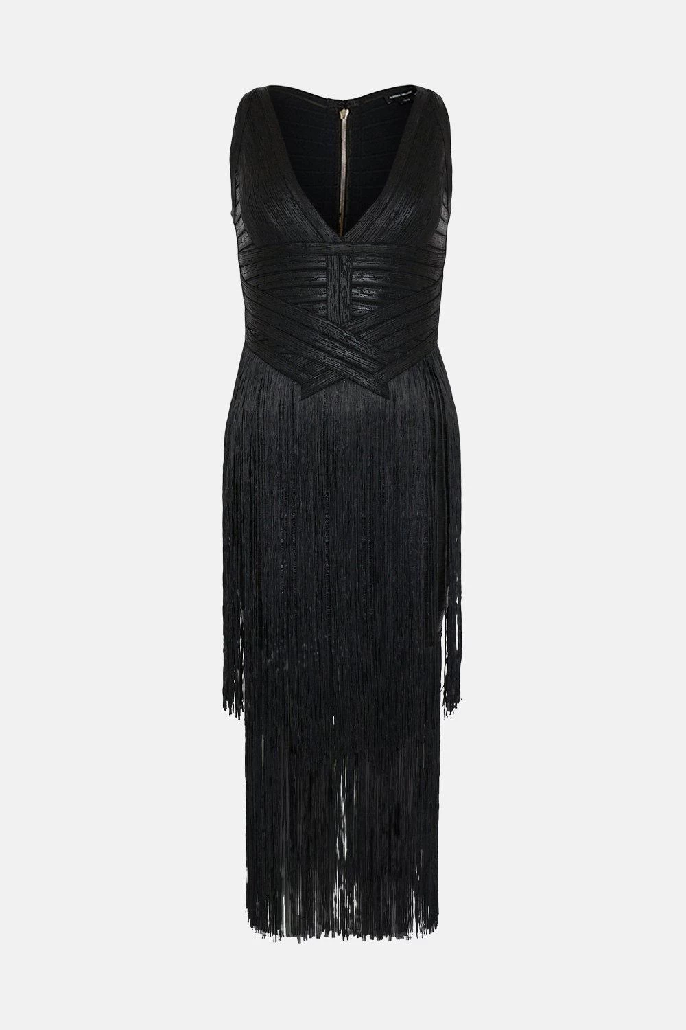 Structured with masterful aplomb, this bandage midi dress is enlivened with rich dimension. Offsetting the close construction, it lands at a playful tasseled skirt that moves with inspired luxury.