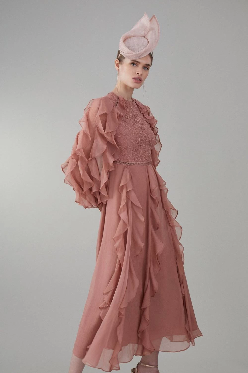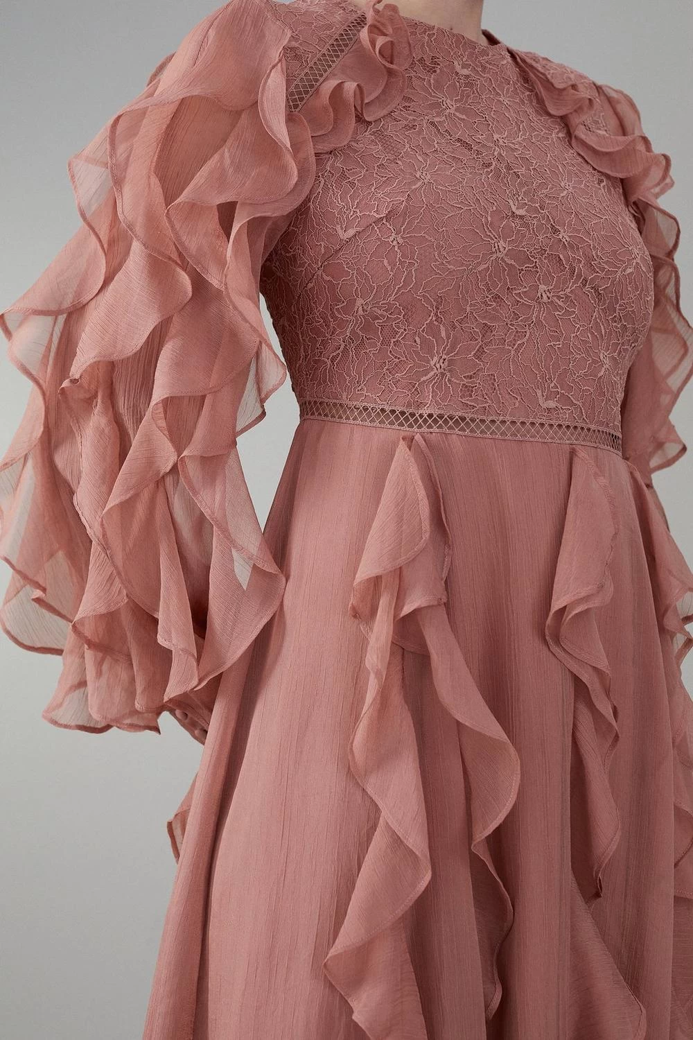 A feminine piece with artisanal flair, this dress features rippling ruffles that sway elegantly with every step. The bodice features intricate lace details, which contrasts beautifully with the frill sleeves. Style this dress with metallic heels and a matching fascinator for a captivating race day or wedding look.