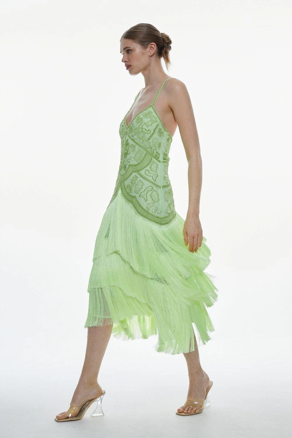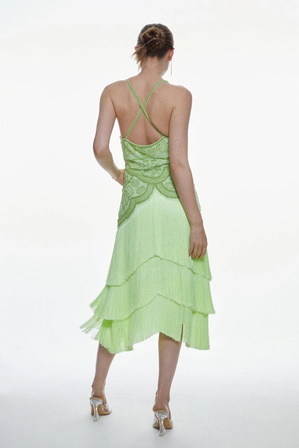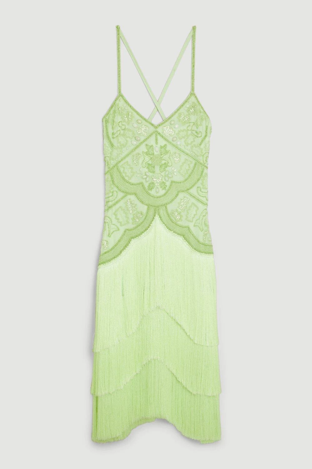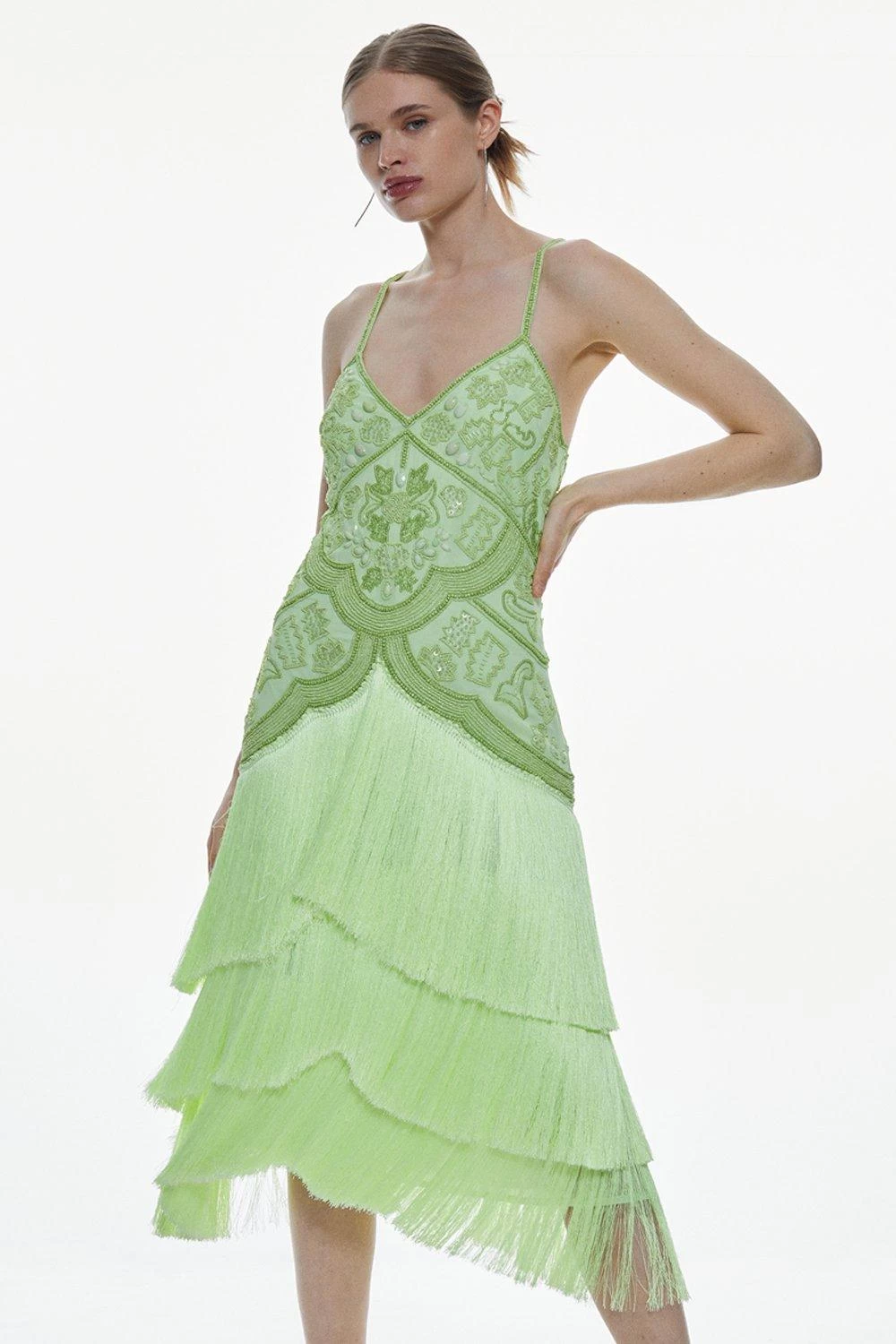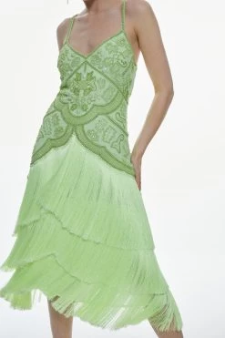 Intricate beads and dramatic tiers of fringing add an opulent, Art Deco twist to this statement midi dress. Rippling beautifully with every move, this decadent dress naturally calls to celebratory occasions.