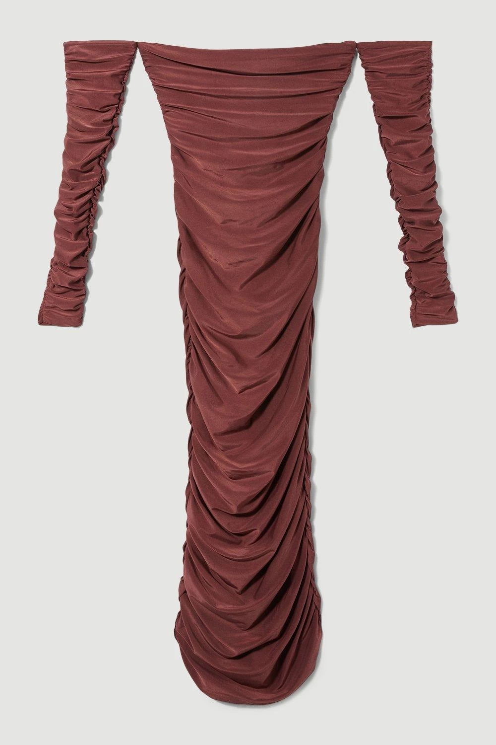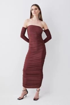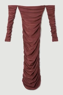 A minimalist design with showstopping appeal, this Bardot maxi dress exudes femininity. Crafted with slinky jersey cloth for a bodycon fit, this dress effortlessly contours the form, while ruched details add further sculpting. For formal occasions, style this piece with an oversized blazer and strappy heels.