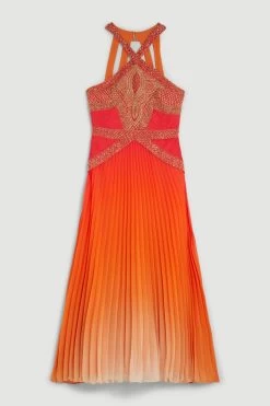 Drenched in flaming hues of scarlet red and vibrant orange, this maxi dress encapsulates the heat of summer. Gold embroidered details infuse this piece with undeniable glamour, while a pleated skirt ensures an elegant silhouette. Style this piece with heels and accessories for a standout occasionwear ensemble.