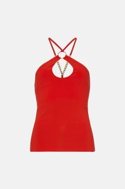 Our designers have emboldened this classic halter top with sultry, sunshine-ready accents. Featuring a circular front clasp, bold cut-out and gleaming, chain-link straps, this feminine design adds a dressed-up twist to tailored shorts and summer suit separates.