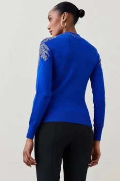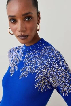 Bring the gothic drama with this opulent knitted jumper. Adorned with sparkling hotfix embellishments that graze each shoulder, it sets a dramatic tone perfect for the cooler days of autumn. The high, studded neckline is complemented by long sleeves and a curve-sculpting fit to accentuate the silhouette with ease.