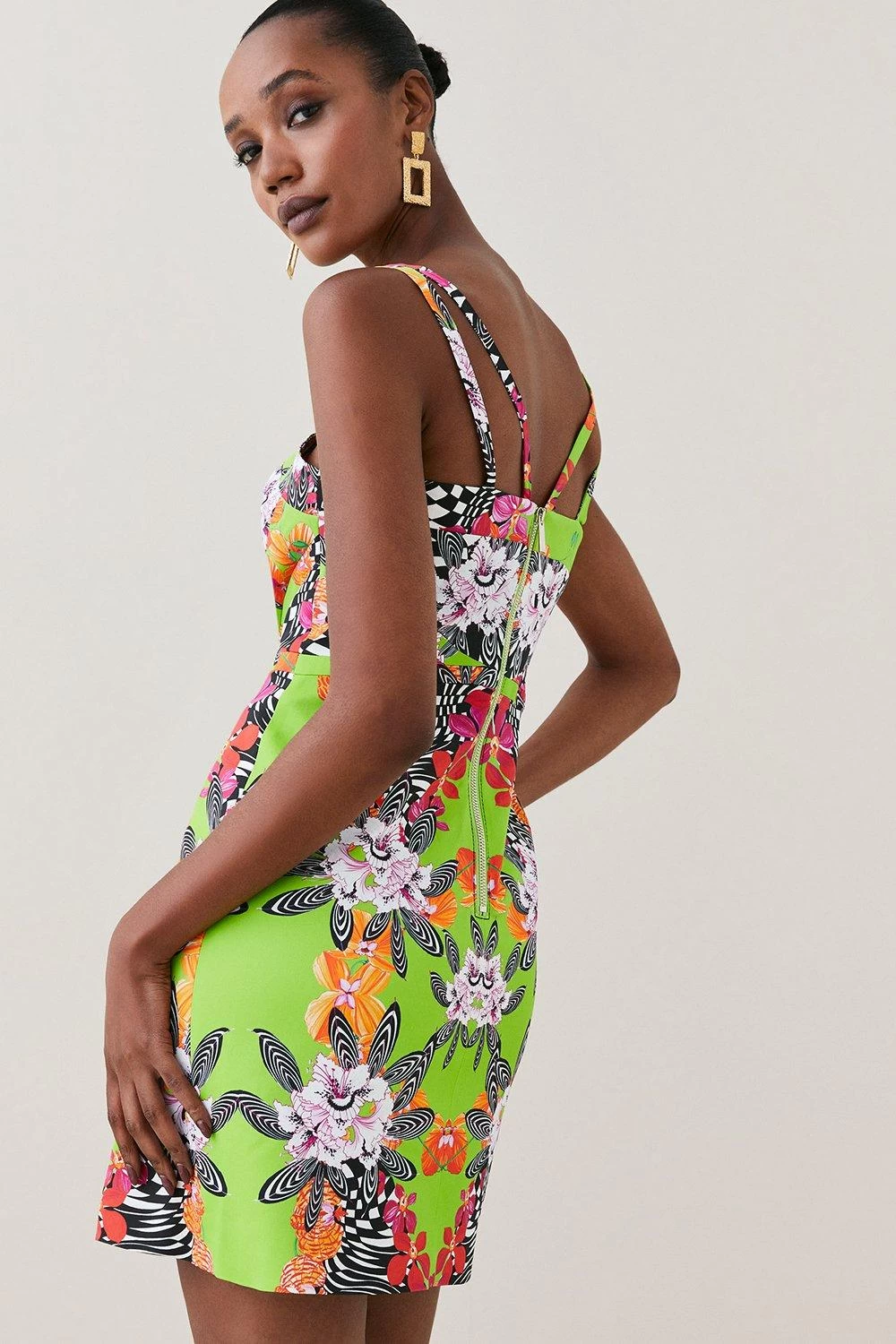 Abstract florals define the contemporary composition of this mini dress. Ultimately modern, this sculpting piece has a caged neckline and corset-inspired bodice, calling to be paired with colour pop stilettos for a cohesive finish.