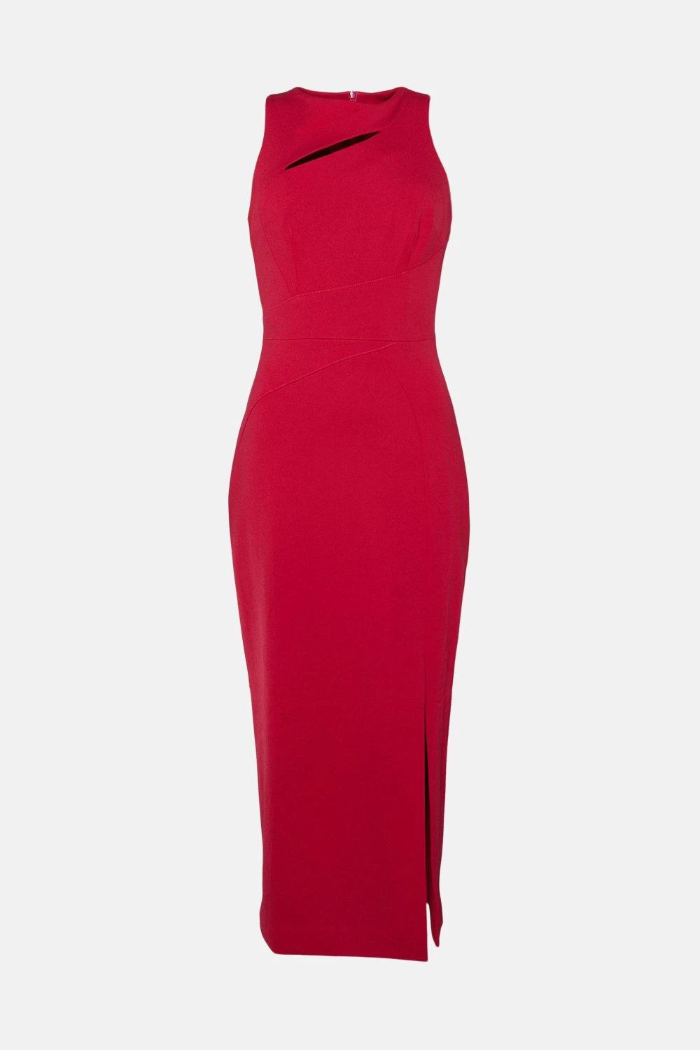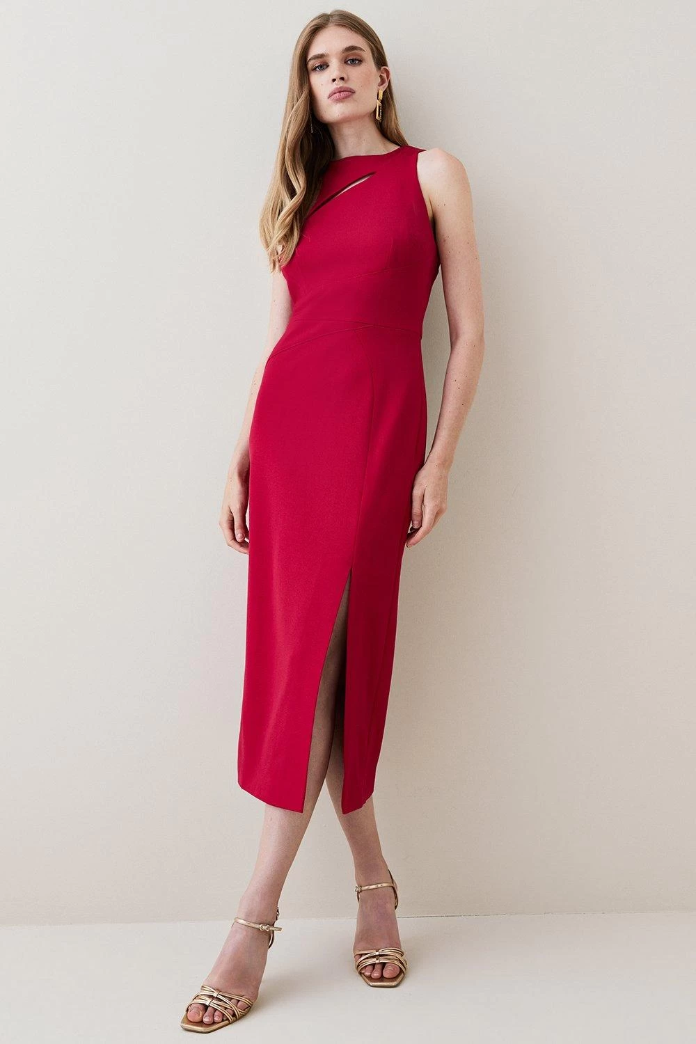 The classic pencil dress takes on new, form-fitting allure with our Italian structured jersey. Contouring the body with a second-skin effect, it boasts contemporary detailing by way of a cut out slash to the high neckline and wrap seaming that defines the waist. Boasting a slit to the hem, pair with soaring stilettos for a fresh spin on polished formalwear.