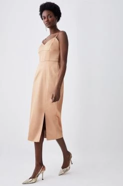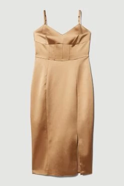 Crafted with a corset-inspired bodice, this piece brings an element of sultriness to occasion dressing. Italian structured satin contours the form, while also creating an opulent mood. Adjustable straps provide functionality.
