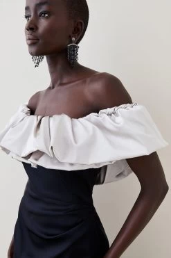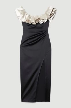 Channel runway-worthy drama in this statement Bardot maxi dress. Featuring an extravagant ruffle design and a high leg slit, this dress can be further elevated with accessories and heels for an event-ready look.
