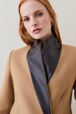 Spun from the revered quality of our Italian virgin wool, the classic double-breasted silhouette is updated with the contemporary addition of faux leather lapels. Boasting timeless characteristics, stay warm with layers of cashmere and matching leather pants.