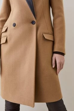 Spun from the revered quality of our Italian virgin wool, the classic double-breasted silhouette is updated with the contemporary addition of faux leather lapels. Boasting timeless characteristics, stay warm with layers of cashmere and matching leather pants.
