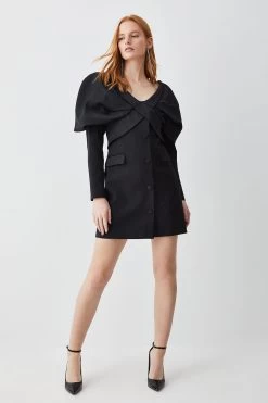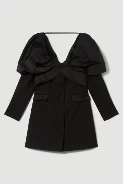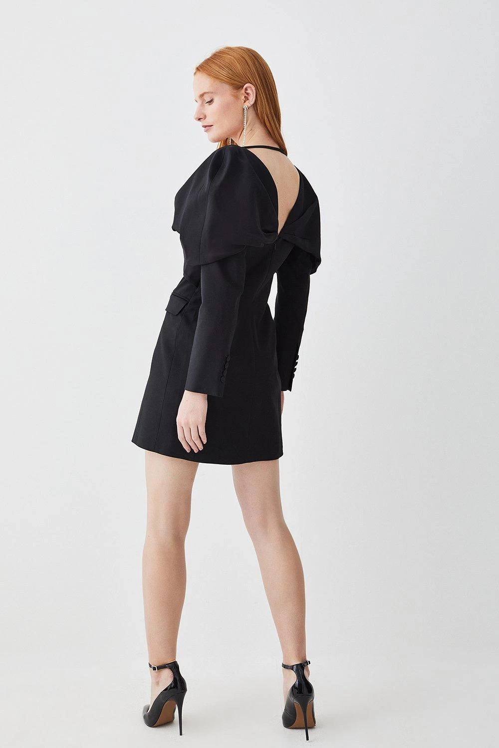 A truly showstopping piece, this mini dress promises to make an entrance at every event. Exaggerated puff sleeves add undeniable drama to this piece, while a tuxedo-style silhouette showcases classic craftmanship. The satin composition provides an element of luxury.