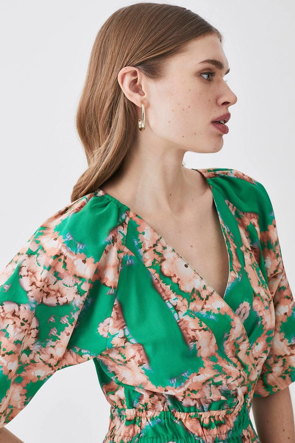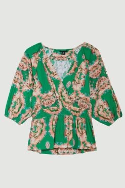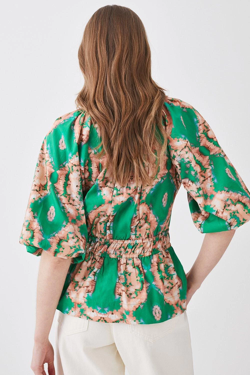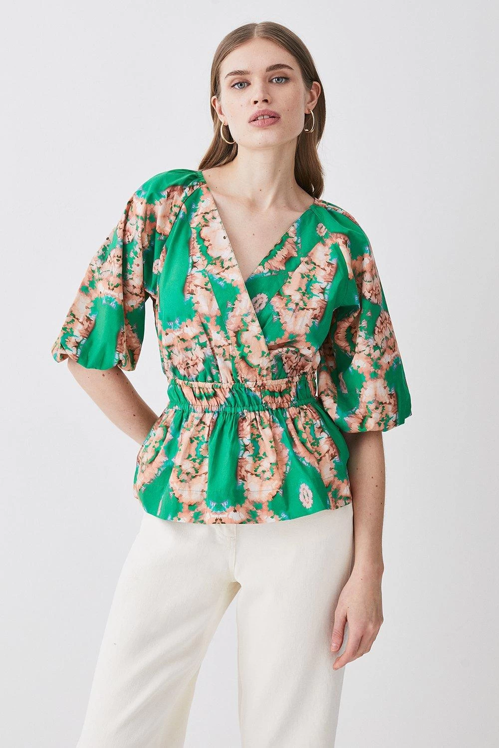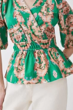 Showcasing vibrant hues and a watercolour blurred print, this blouse is perfectly suited to warmer climes. A shirred waistband creates a flattering peplum silhouette, further complemented by short puff sleeves and a V-neckline.