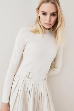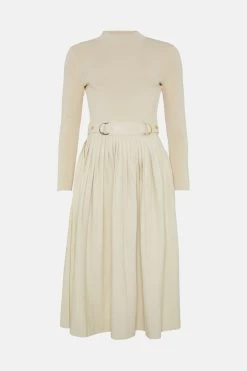 Make getting ready ultra-easy with this versatile midi dress. Giving the appearance of sleek separates, the piece features a knitted funnel-neck bodice and pleated PU midi skirt. Finished off with a D-ring belt, it also offers an on-trend utility feel.