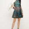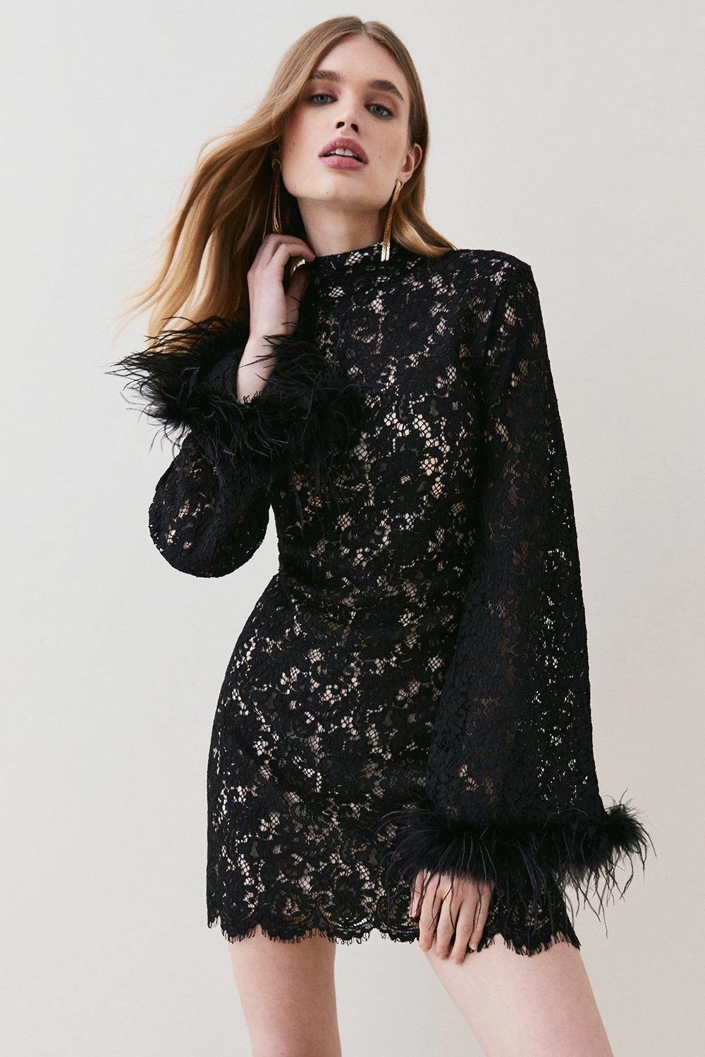 Blooming with botanical embroidered mesh, this mini dress channels the majesty of the midnight hour with an intoxicating ensemble. From the feather-trimmed cuffs to the scalloped open back, pair this piece with towering platforms to offset the after-dark references.