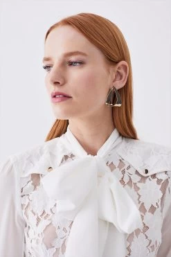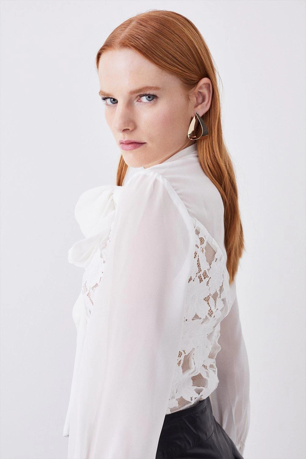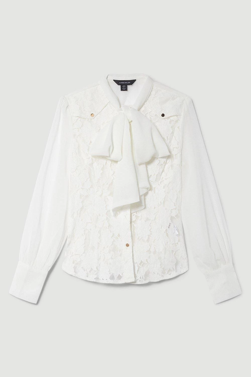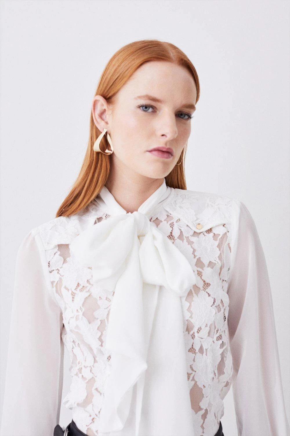 A classic design with timeless appeal, allow this blouse to elevate everyday looks. Lace details add an elegant touch, while a front pussy bow adds a dramatic flourish.