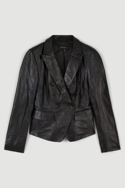 Leather, meet blazer.. Crafted from our signature high-quality leather, this jacket is ultra-soft and durable enough to last you all season – and beyond. An elevated spin on the faithful blazer, this one comes complete with a notched collar, double-breasted buttons and side pockets.