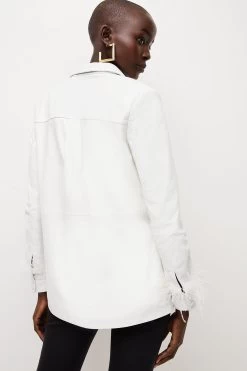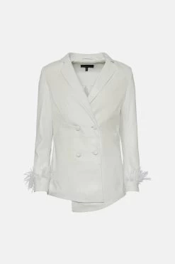 Leather and feathers combine with flamboyant effect on this covetable longline blazer. Detailed with traditional trims ? notched lapels, double-breasted buttons and a sleek, androgynous fit ? this luxe design is perfect for parties. Accentuate the feather-trimmed cuffs with a sparkling cocktail ring or chunky chain-link cuff.