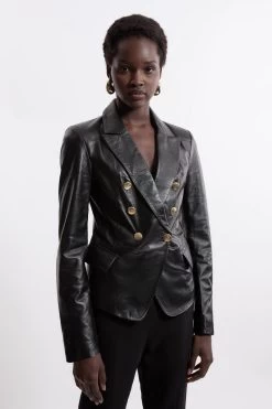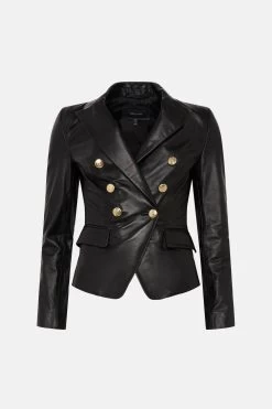 Our designers have revamped the classic blazer to ultra-modern effect this season. Crafted from the finest leather, this luxurious design shows off glossy gold buttons, notched lapels and flap pockets for a classic look, but feels oh-so-contemporary thanks to its glossy leather construction.