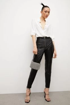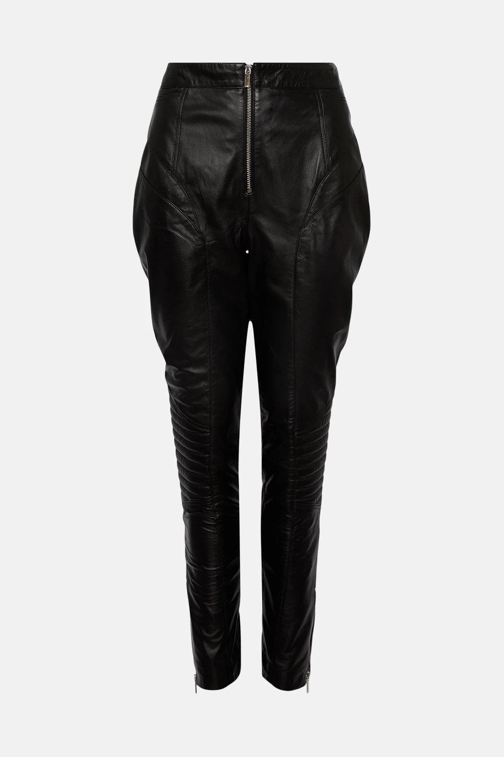 Enduringly elegant but undeniably edgy, these premium leather trousers come cut to always flatter your figure. They feature a high-rise waistline framed by a daring silver-toned zip, straight legs and zipped hems. Detailed with seams and panelling for a nod to the biker trend, they look best worn with a voluminous shirt and spike heels.