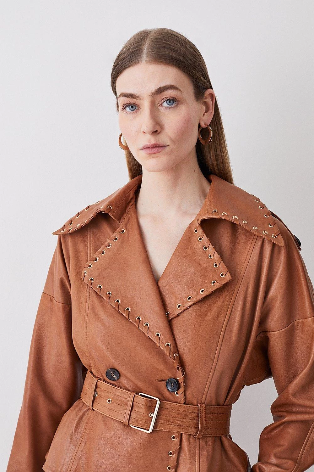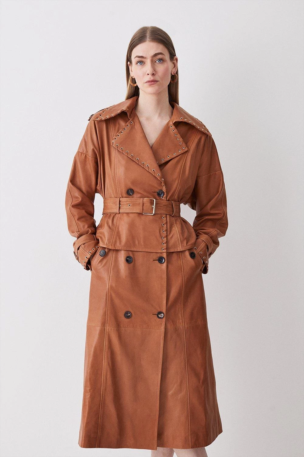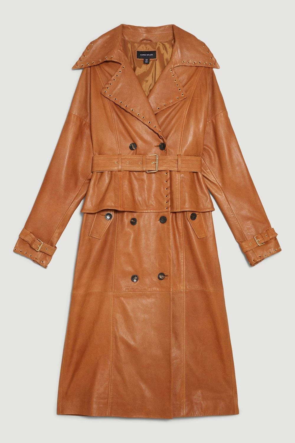 This trench coat expertly combines a contemporary aesthetic with a classic mood. This piece is crafted from luxe leather which creates a classic, clean fit that transcends trends. Detailed with visible stitching and signature KM embossed buttons, this trench coat makes a unique addition to outerwear collections.