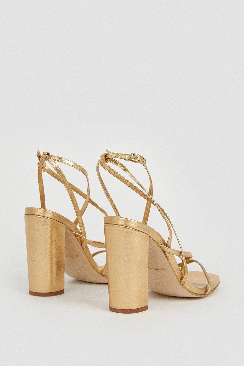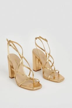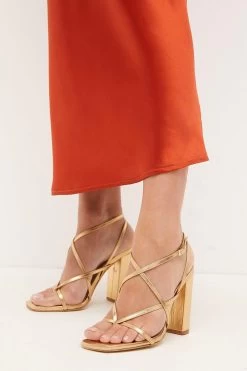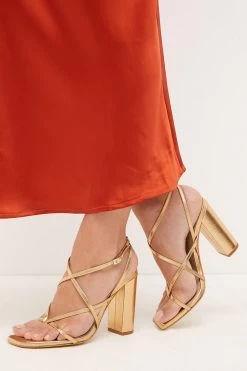 Framing the feet beautifully with crossover metallic straps, these heeled sandals are perfect for balmy holidays and summer parties. They feature chunky block heels for a sense of stability and fasten simply at the ankle with chic rectangular clasps. Offset the gleaming finish with colour-pop separates for a truly head-turning party look.