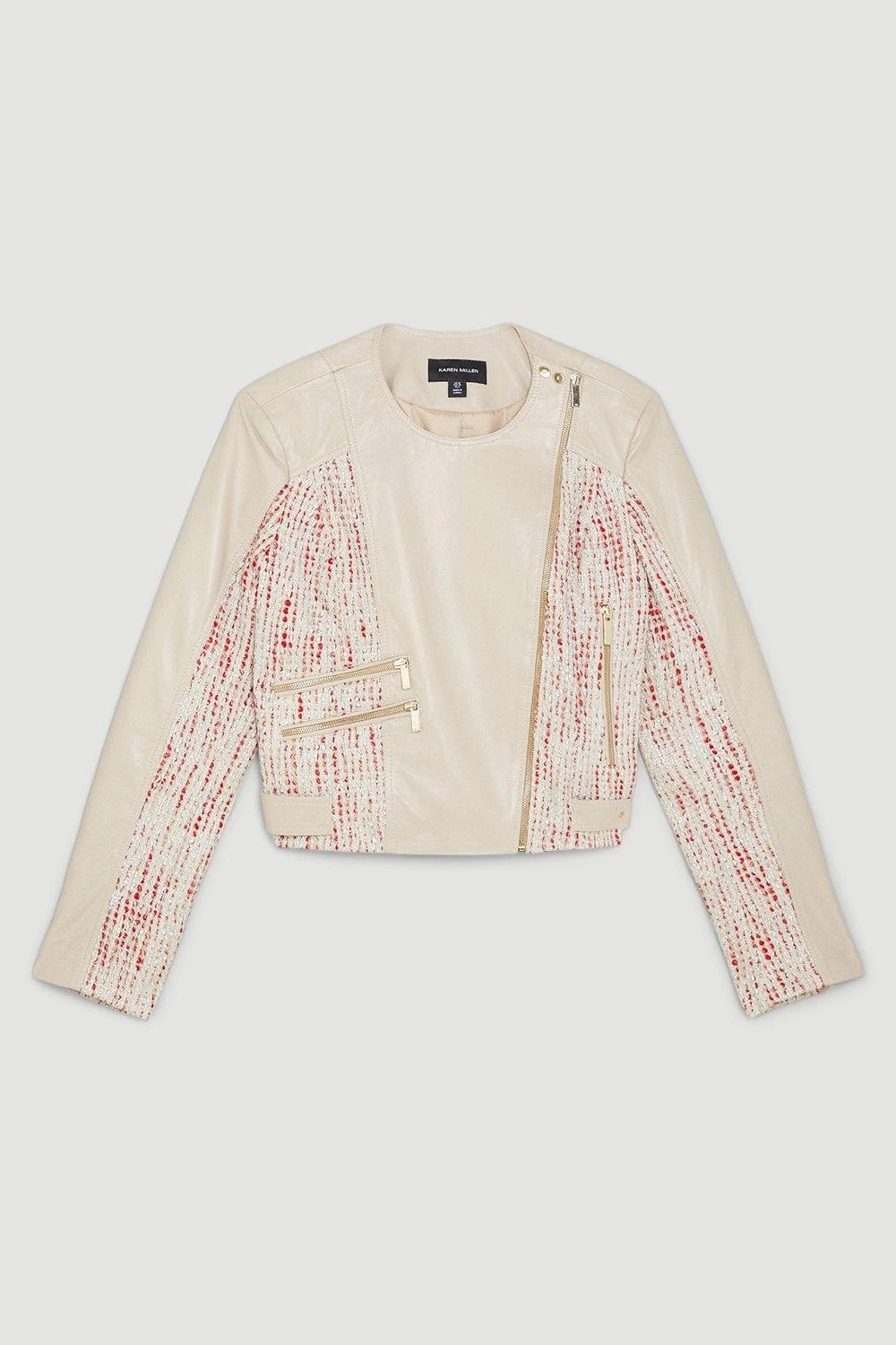 Karen Millen Leather Tweed Panel Detail Collarless Biker Jacket