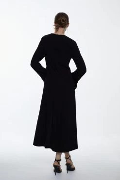 A combination of sultry and sophisticated, this midi dress exudes understated elegance. This fluid silhouette is elevated with a side leg slit, while flared sleeves add a touch of drama.. A front keyhole detail adds a polished finish.