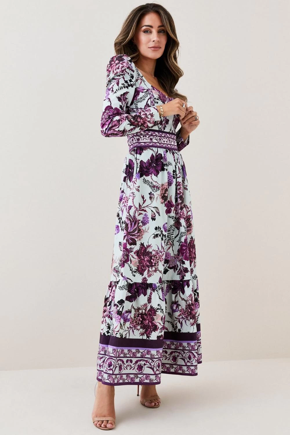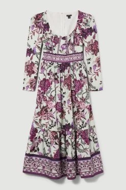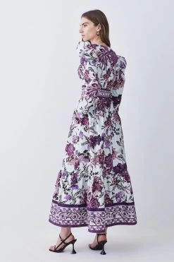 Enriched with opulent floral prints in vibrant purple hues, this woven midi dress can be styled from season to season with ease. Puffed shoulders and a collared neckline add an air of sophistication to the piece, while a cascading skirt exudes elegance.
